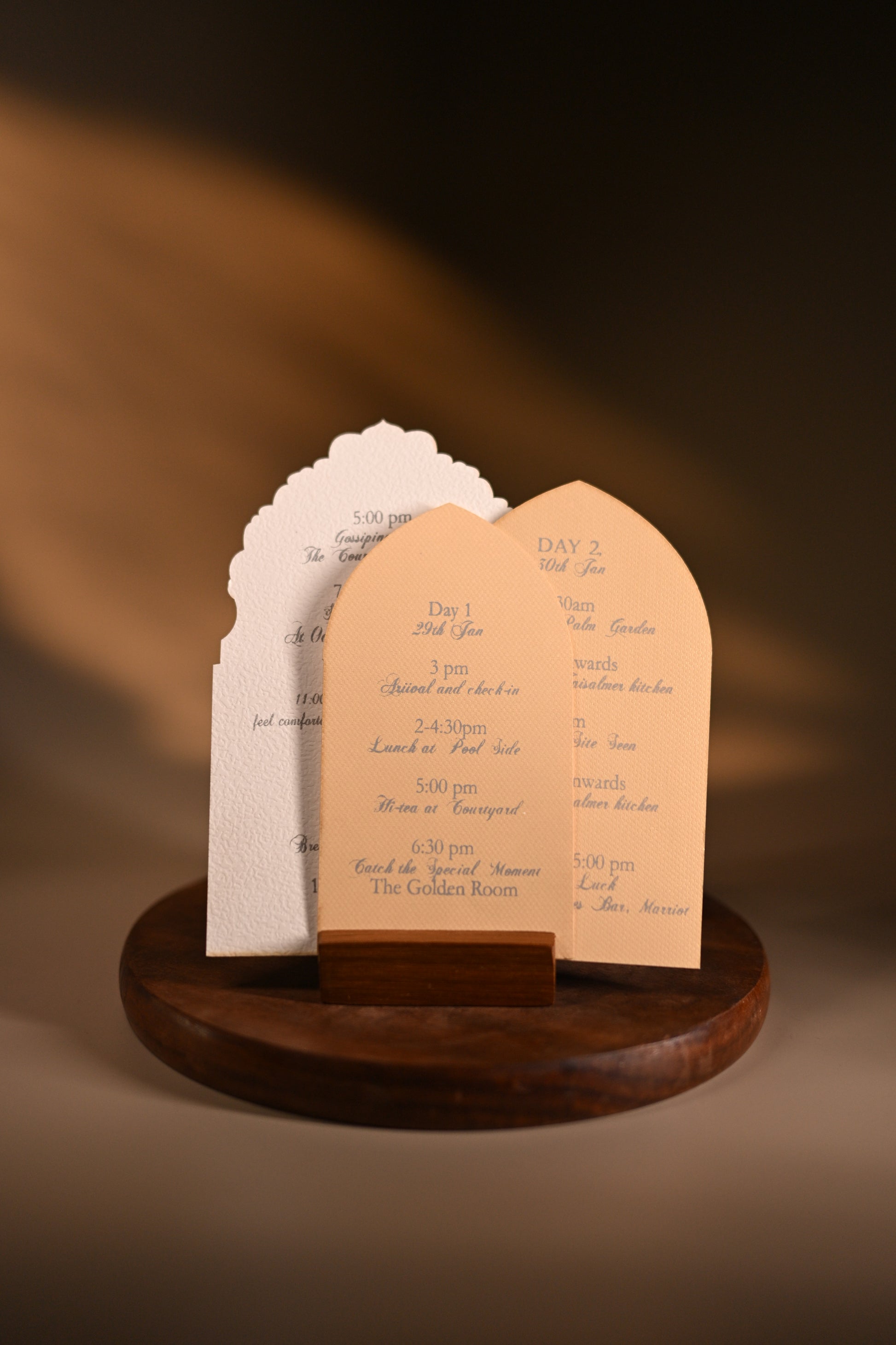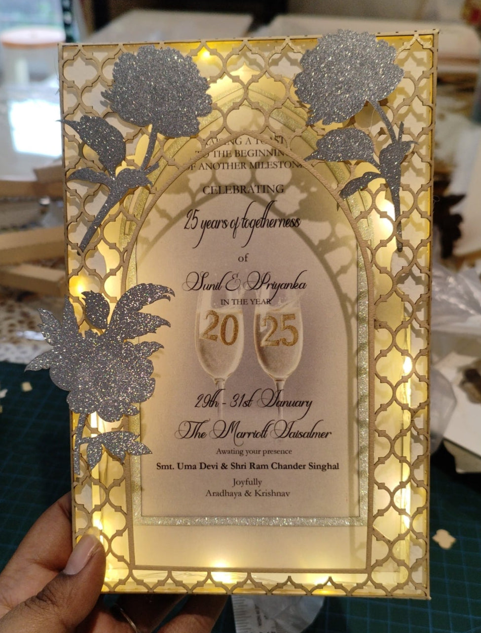 The table mat was specially designed with a golden acrylic laser-cut pattern, beautifully inserted into the mat for a rich, decorative look. On the left side of each mat, we placed the invitation card, which was one of the highlights it featured a 3D effect with light inside, making it truly eye-catching and unique.