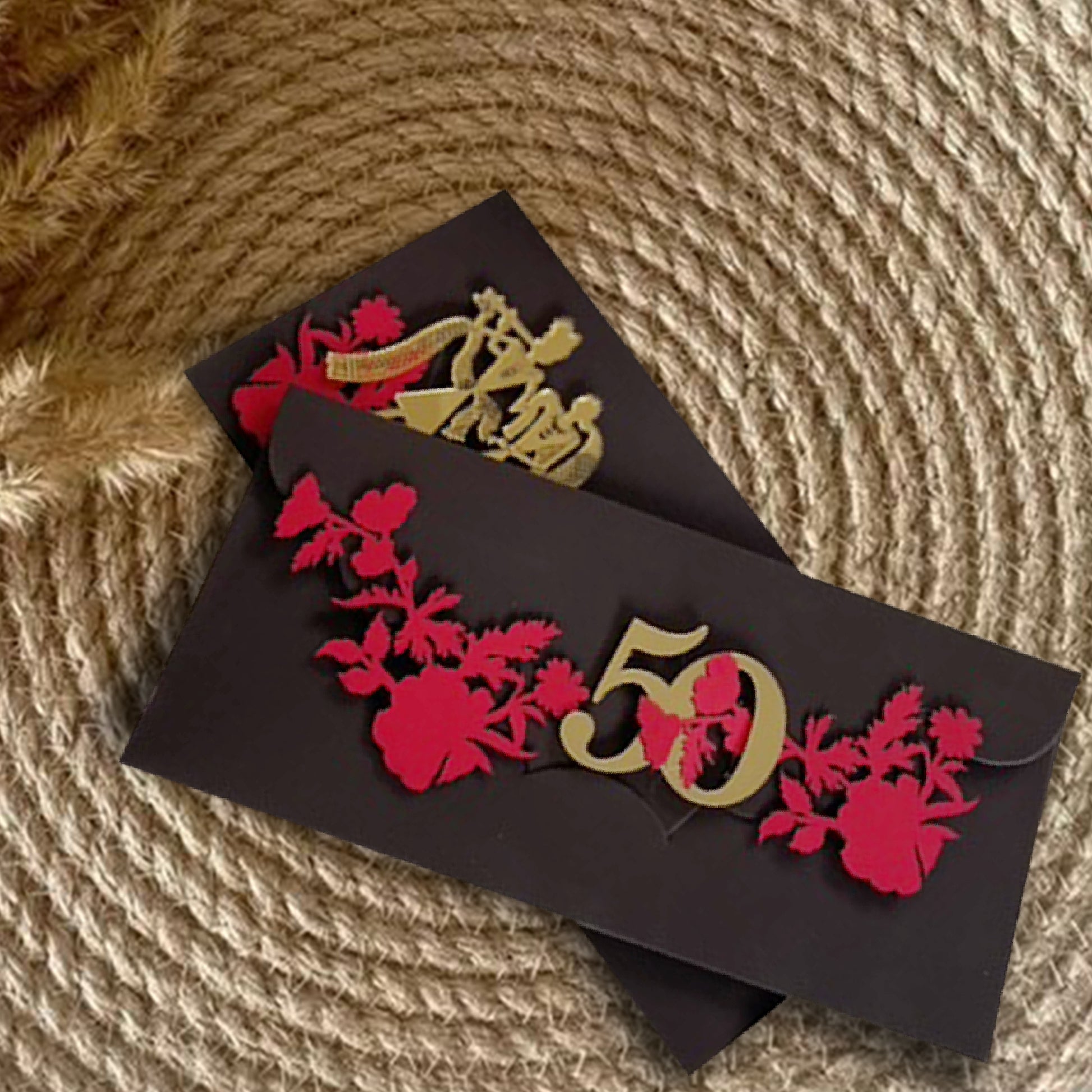 The envelope is designed for a 50th anniversary celebration. It is made of brown paper. The flap of the envelope is decorated with a red floral laser cutting. In the center of the flap, there is a golden acrylic number "50" to highlight the anniversary.