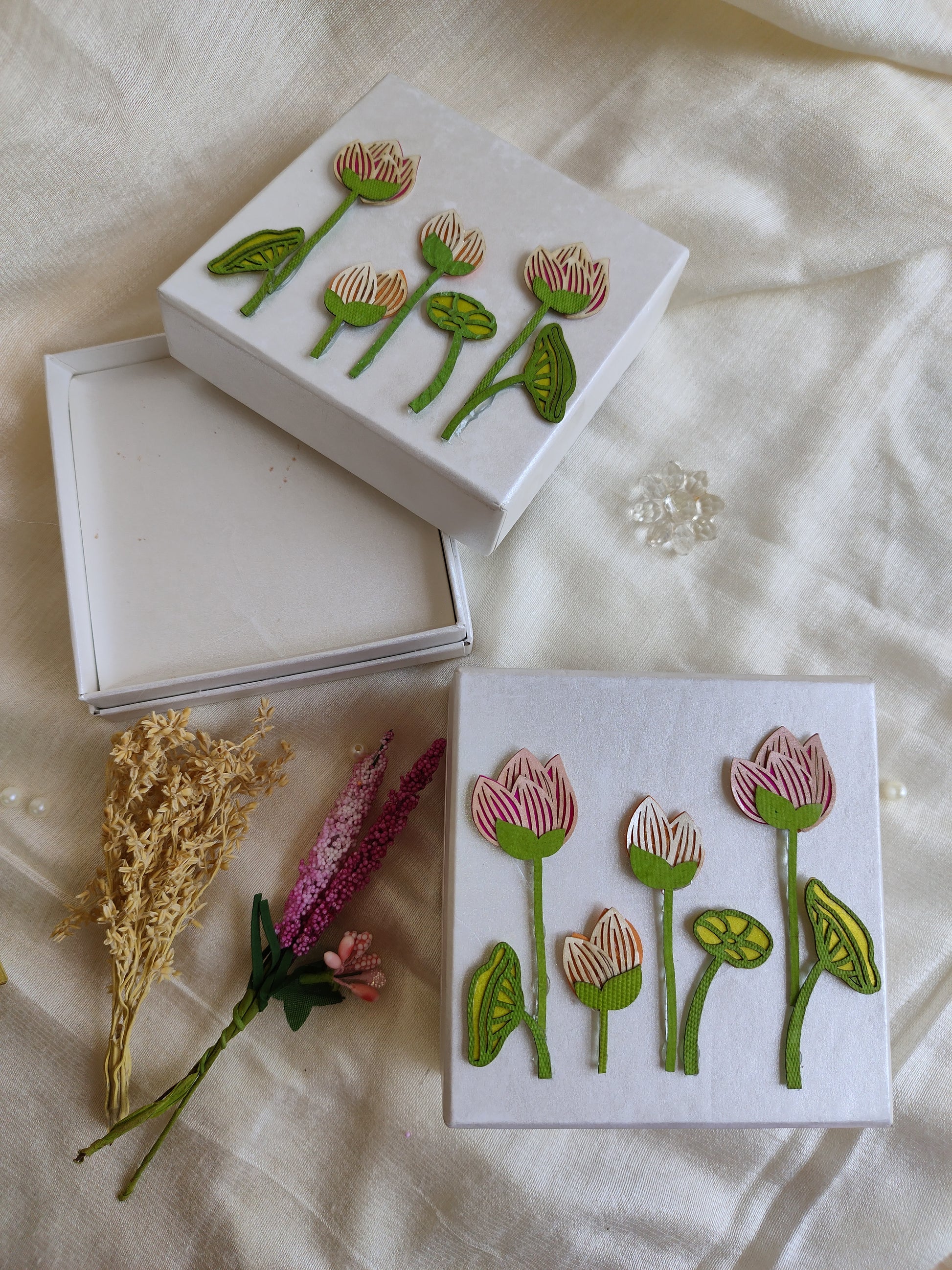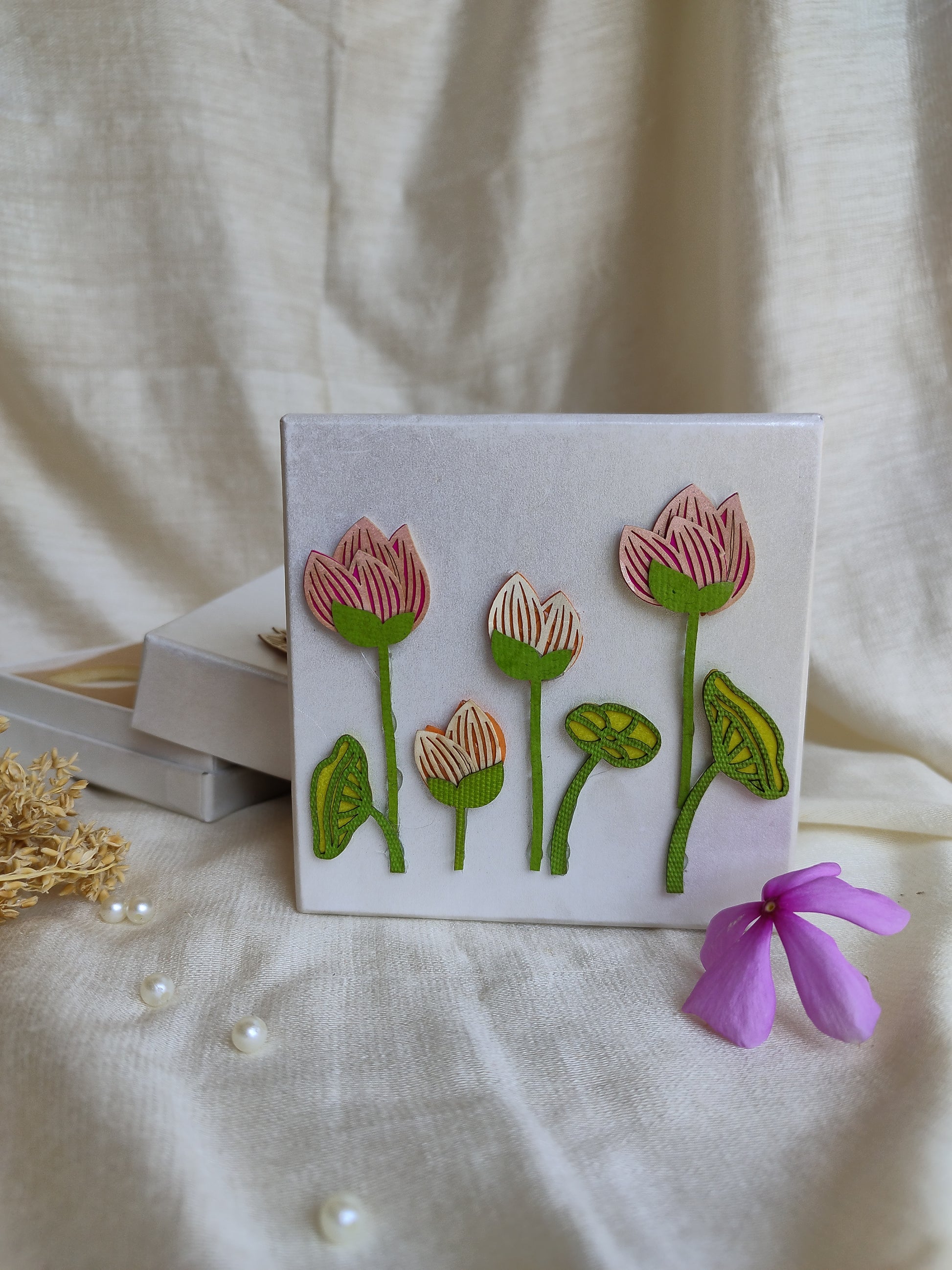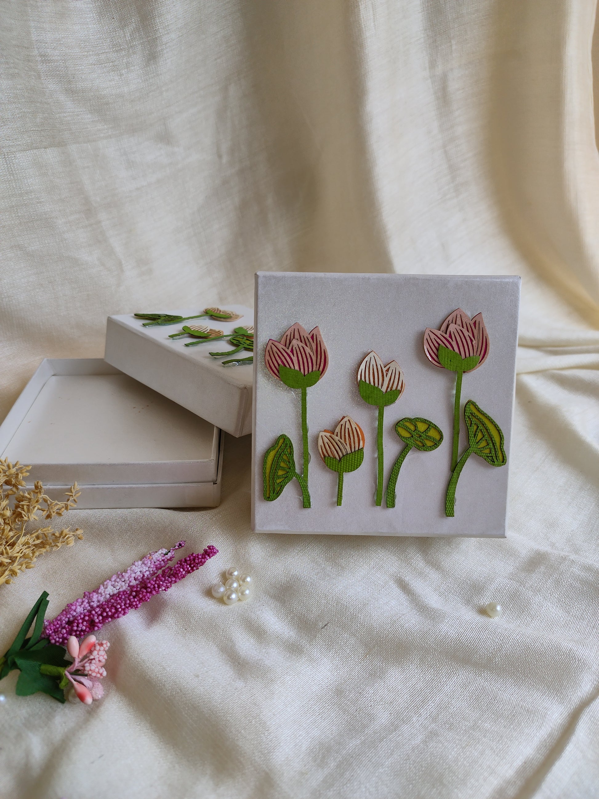 Our 3D LOTUS gift boxes are crafted from sturdy cardboard material. The size is carefully chosen to fulfill all the box's intended purposes. It's an ideal fit for a bank ginni even if a card is included along with the ginni. We also provide a round cut frame for a round ginni to fit into it. It can also be used for gifting earrings and cuff links etc.