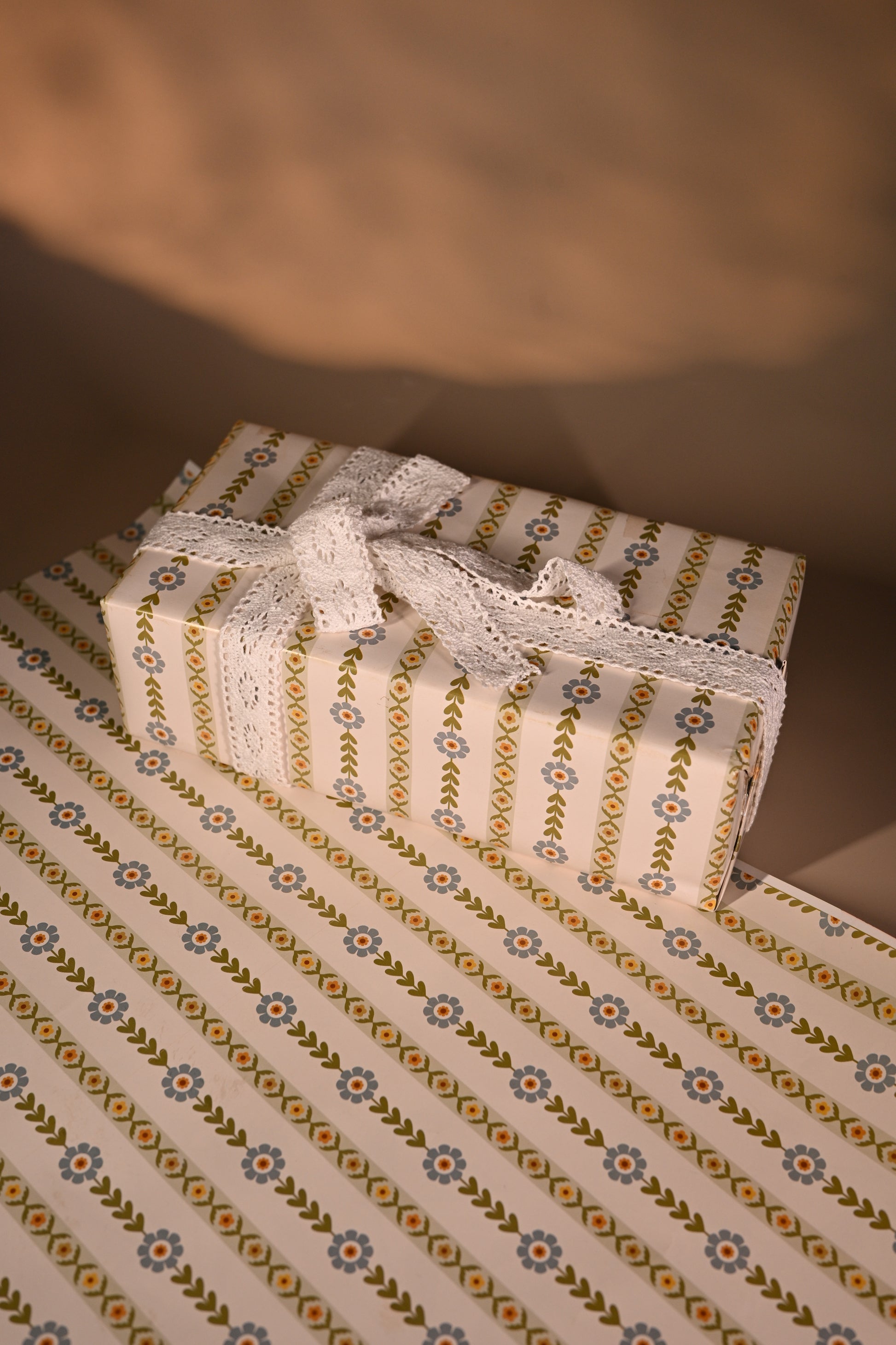 This wrapping paper has a soft and earthy feel with neat diagonal stripes of tiny blue and orange flowers and green leaves. The cream background adds a warm touch, making it look clean and elegant. It’s perfect for wrapping gifts with a natural, simple, and charming look—great for birthdays, small celebrations, or thoughtful gifting.