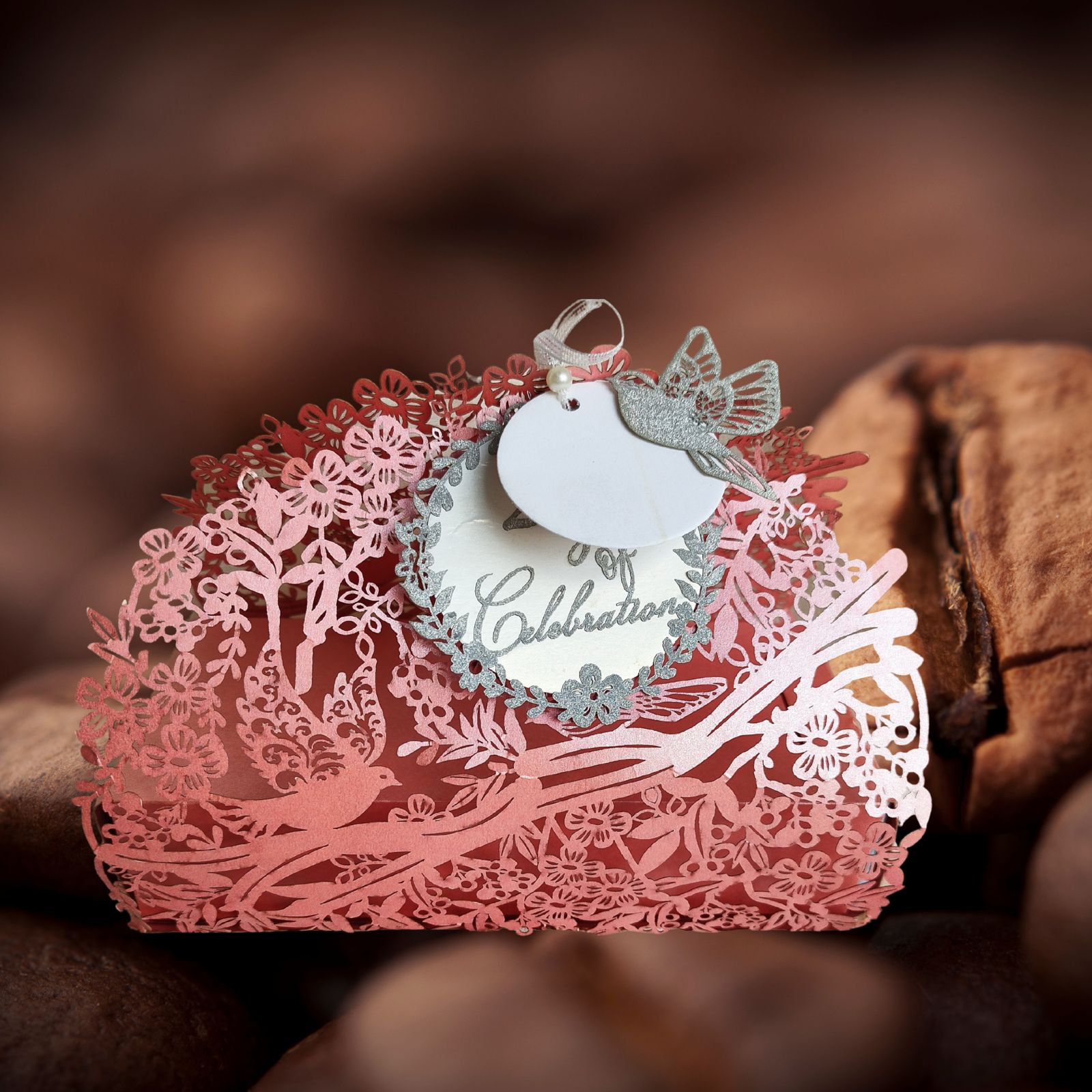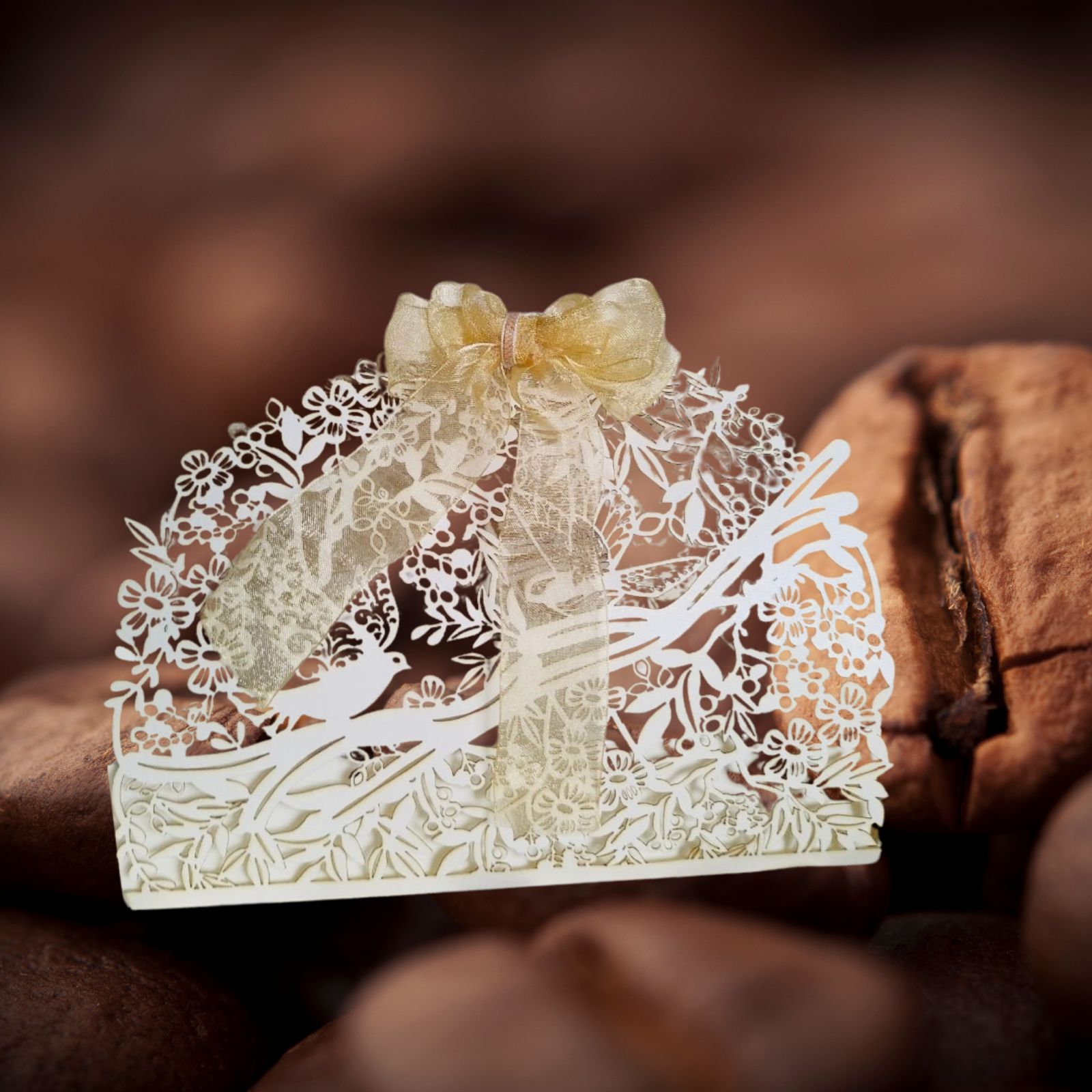 The box features an intricate full laser-cut design that showcases a stunning arrangement of floral patterns, delicate leaves, and graceful birds perched on branches. The precision of the laser cut adds a luxurious and handcrafted touch to the overall look.