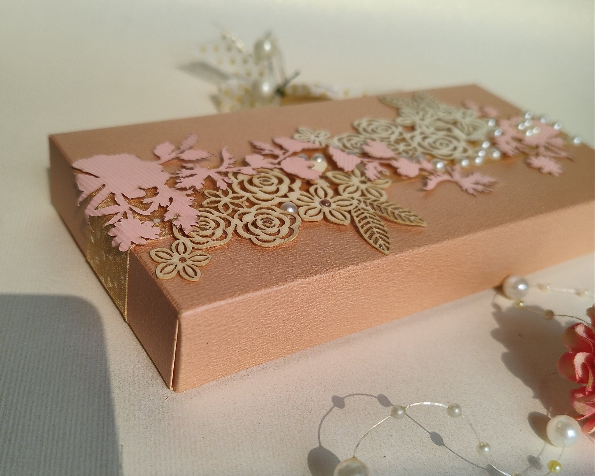 This soft cash box is an eye-catching piece. We used white & pink floral cutouts and white silverish ribbon here. To add on, we spread the motis all over which gives it an elegant look.