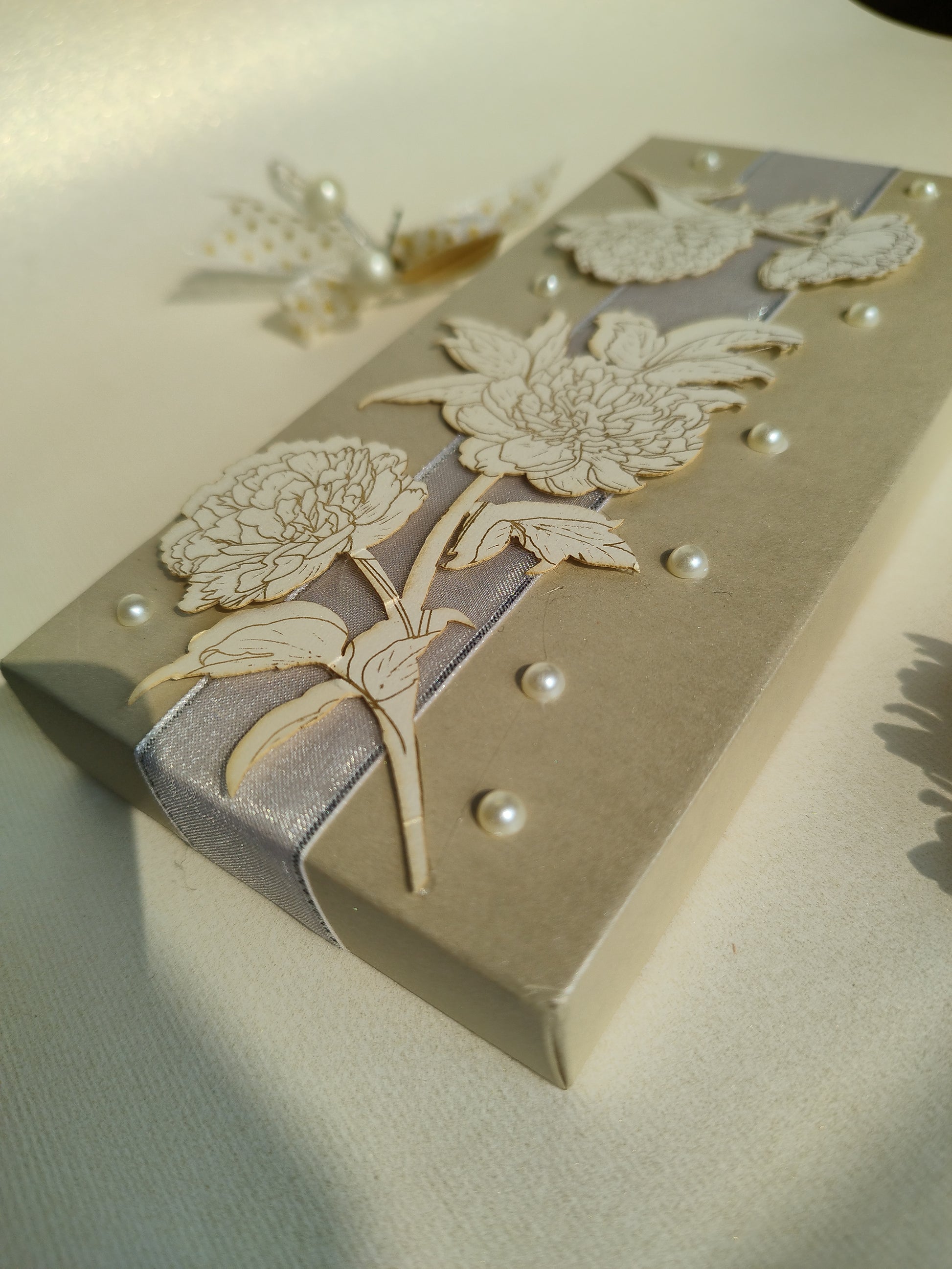 This soft cash box is an eye-catching piece. We used gold print cutouts and white silverish ribbon here and to add on we spread the motis all over which gives it an elegant look.
