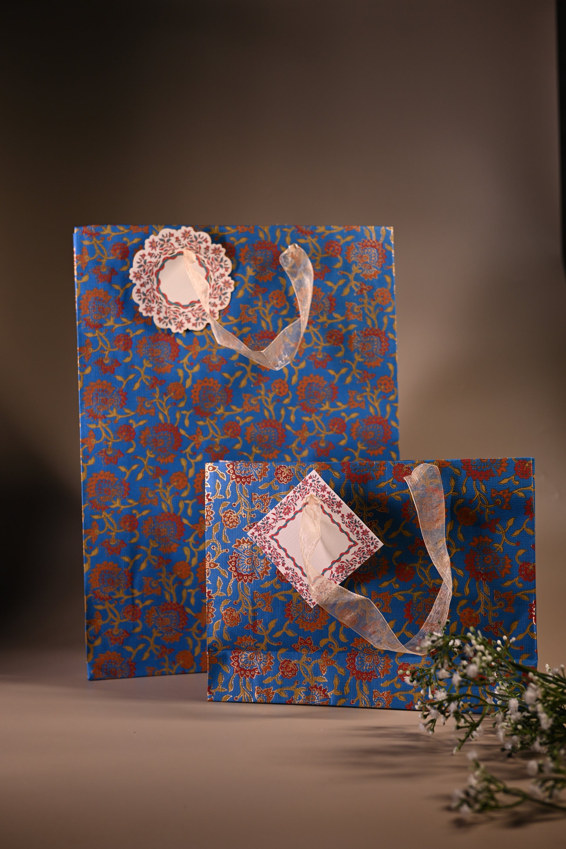 This is a beautiful handmade paper bag, perfect for gifting. It has a rich blue background with elegant gold and red floral designs printed all over it. The bag is tied with a soft, transparent tissue ribbon, giving it a delicate and classy touch. There's also a matching tag attached, which you can write on.