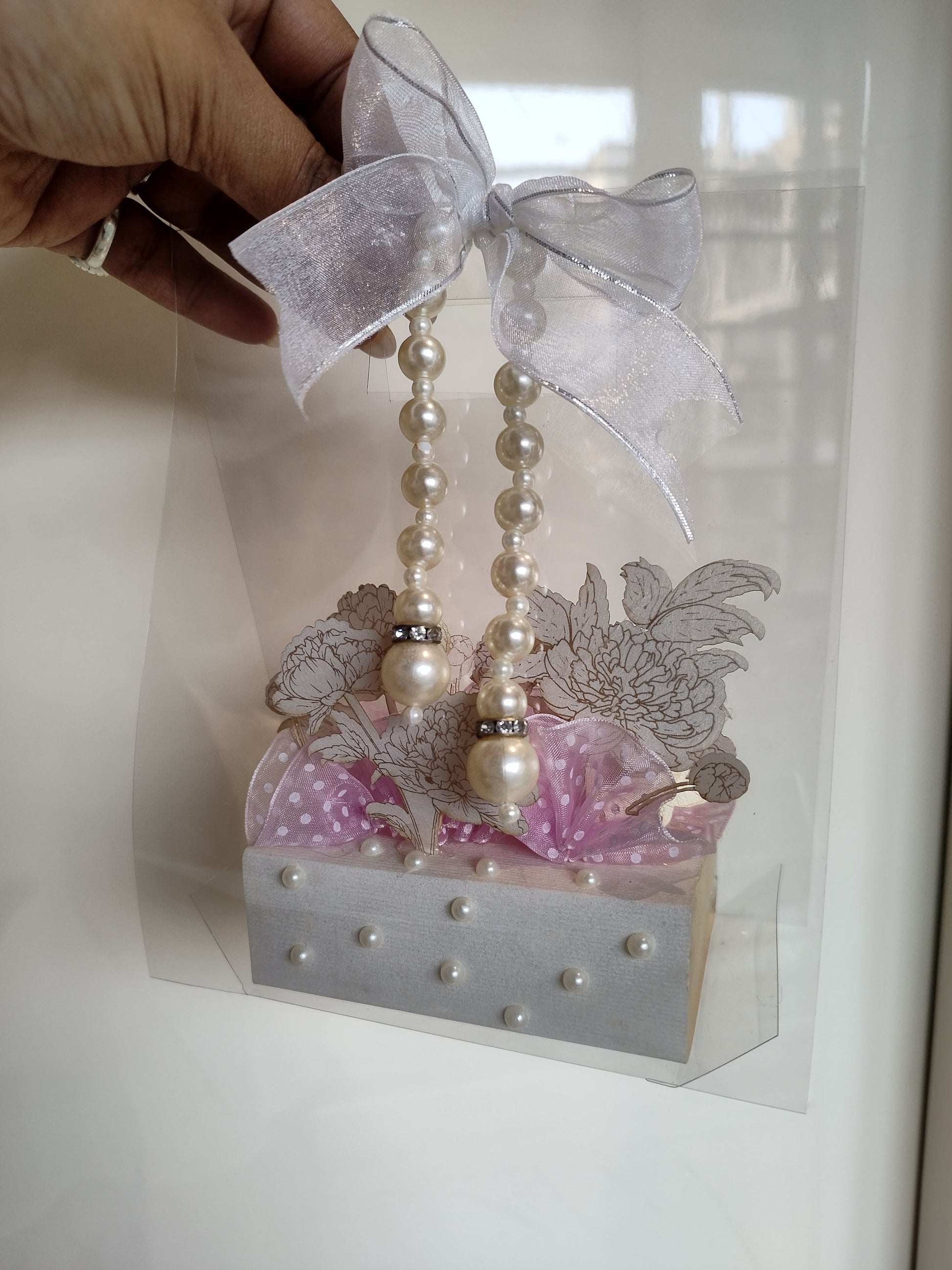 - Glossy 250gsm Paper, This is a metallic silver envelope with a shiny and elegant look. It is decorated with a silver ribbon, The envelope also features golden printed floral designs along with laser-cut floral patterns