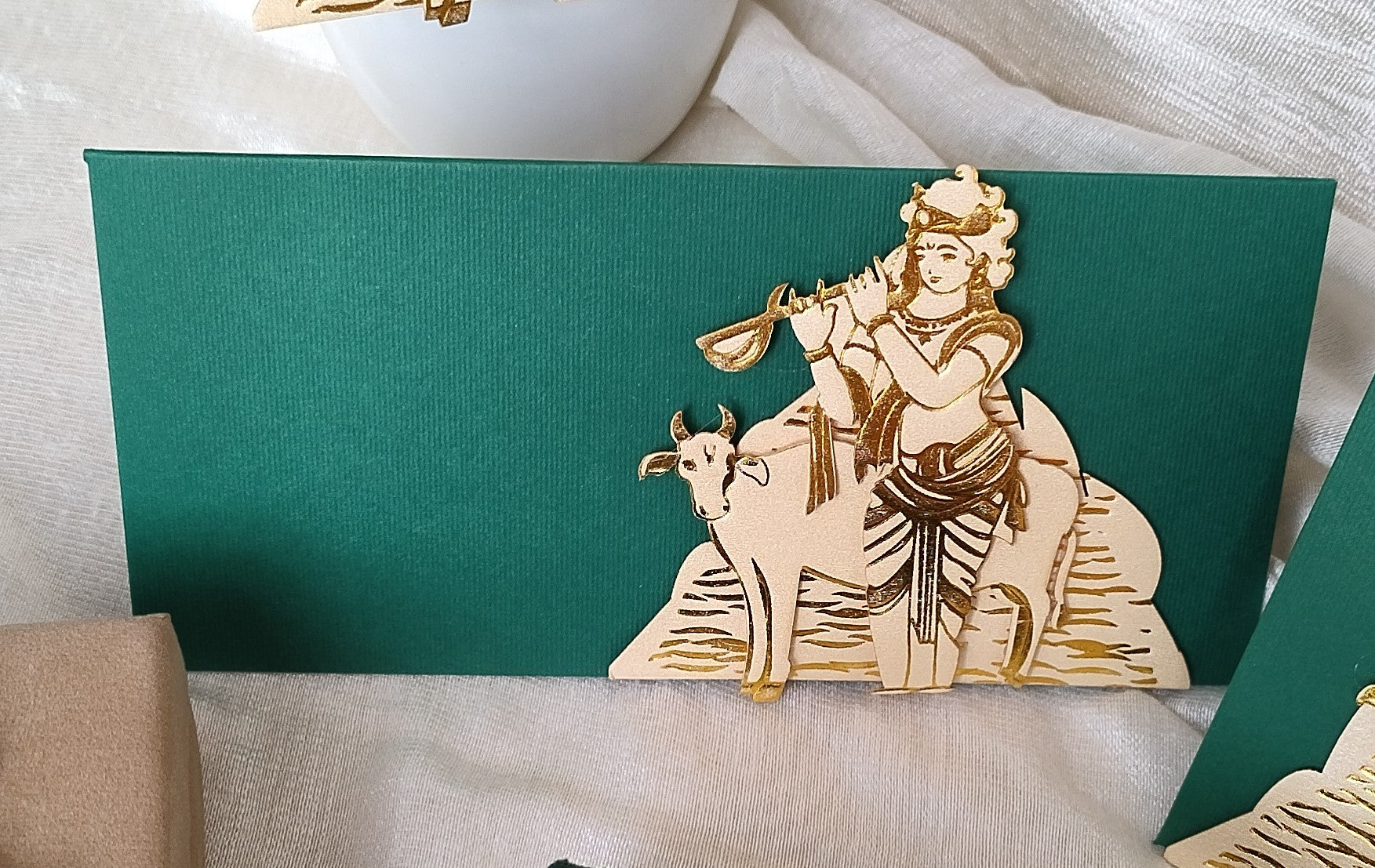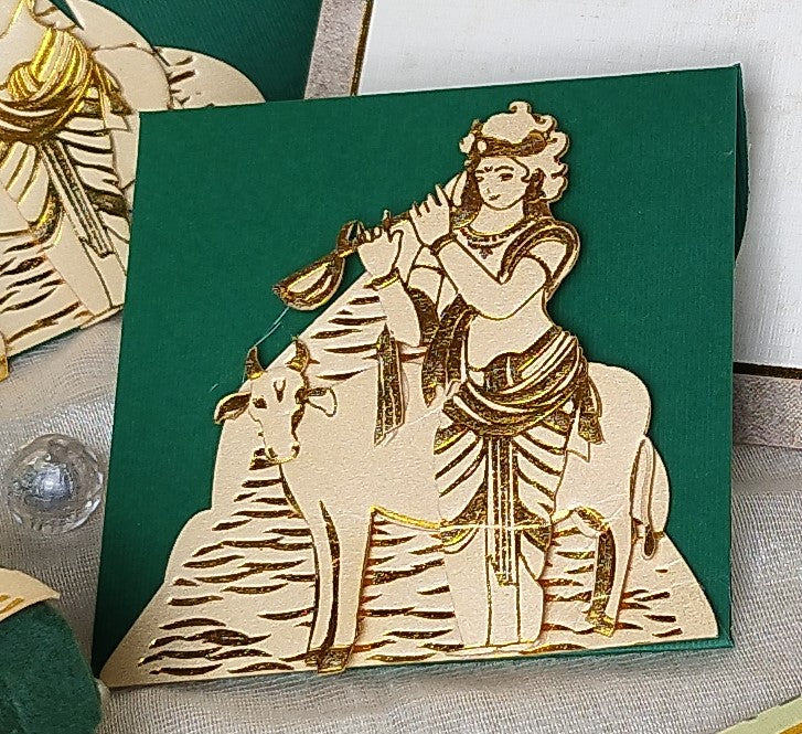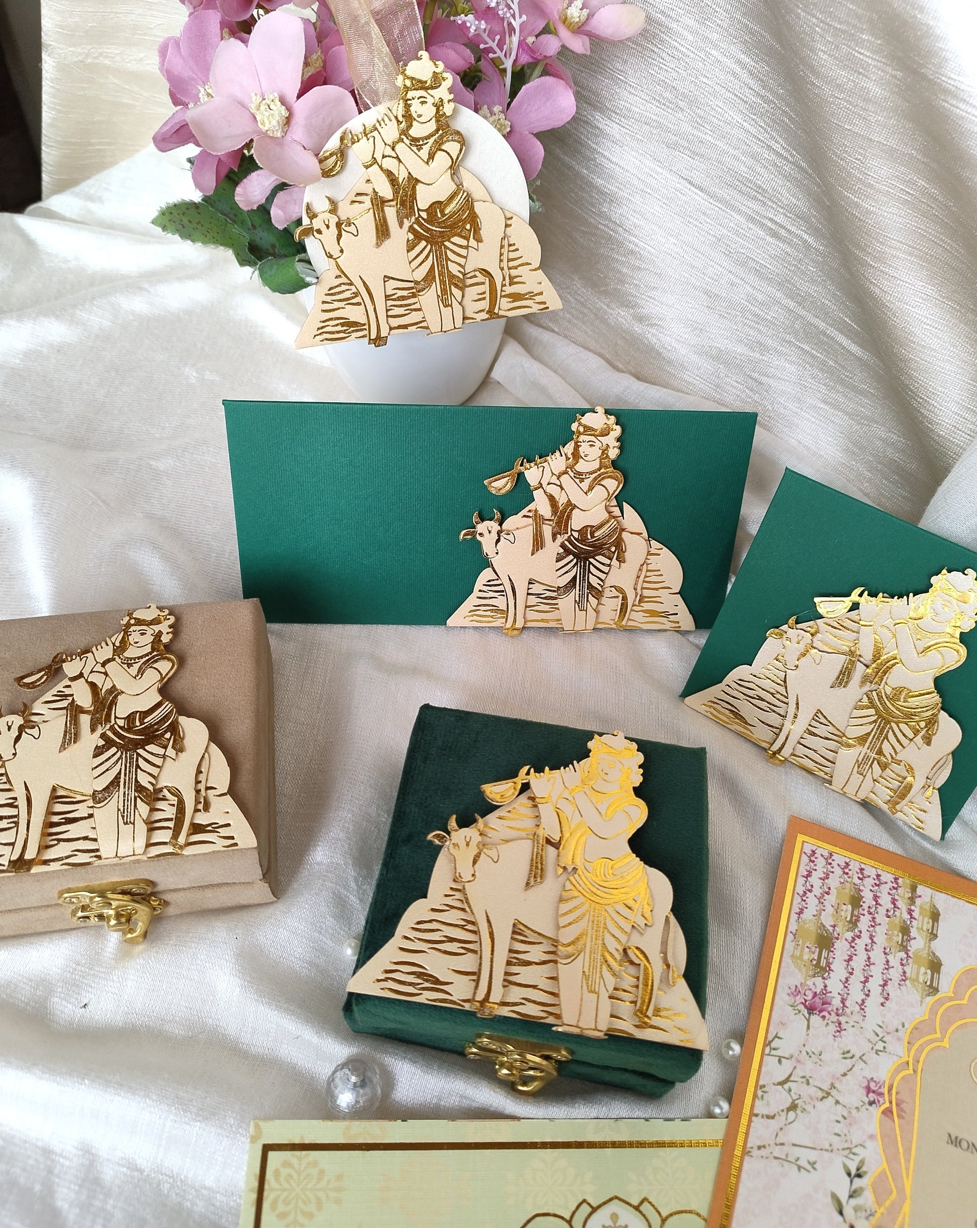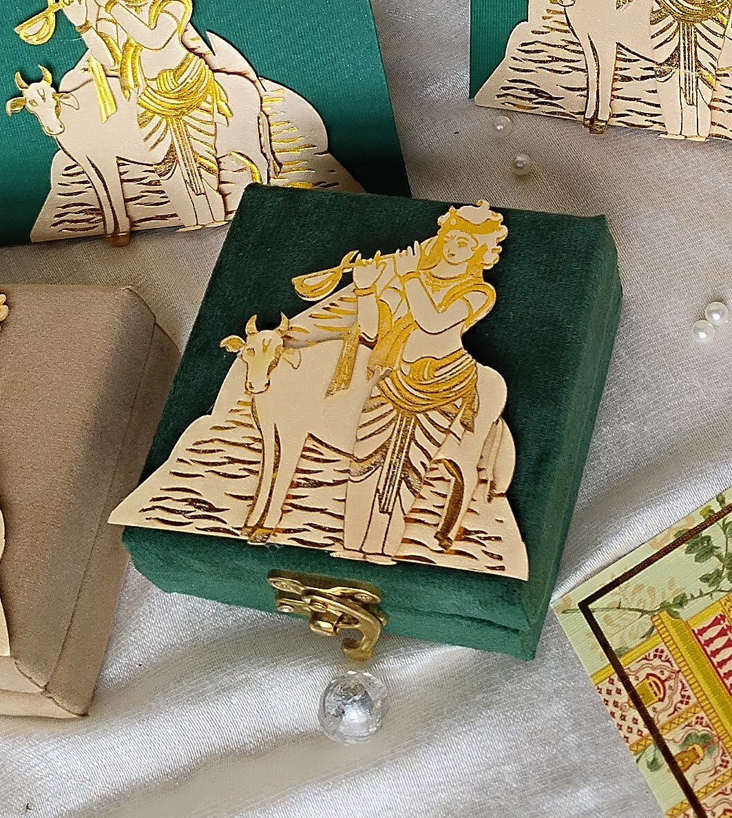 We used the same Krishna and cow design on the small envelopes and also on the velvet green and beige boxes. These boxes were decorated with a foil-embossed cutout and finished with a round tag on top, keeping the theme consistent and graceful.