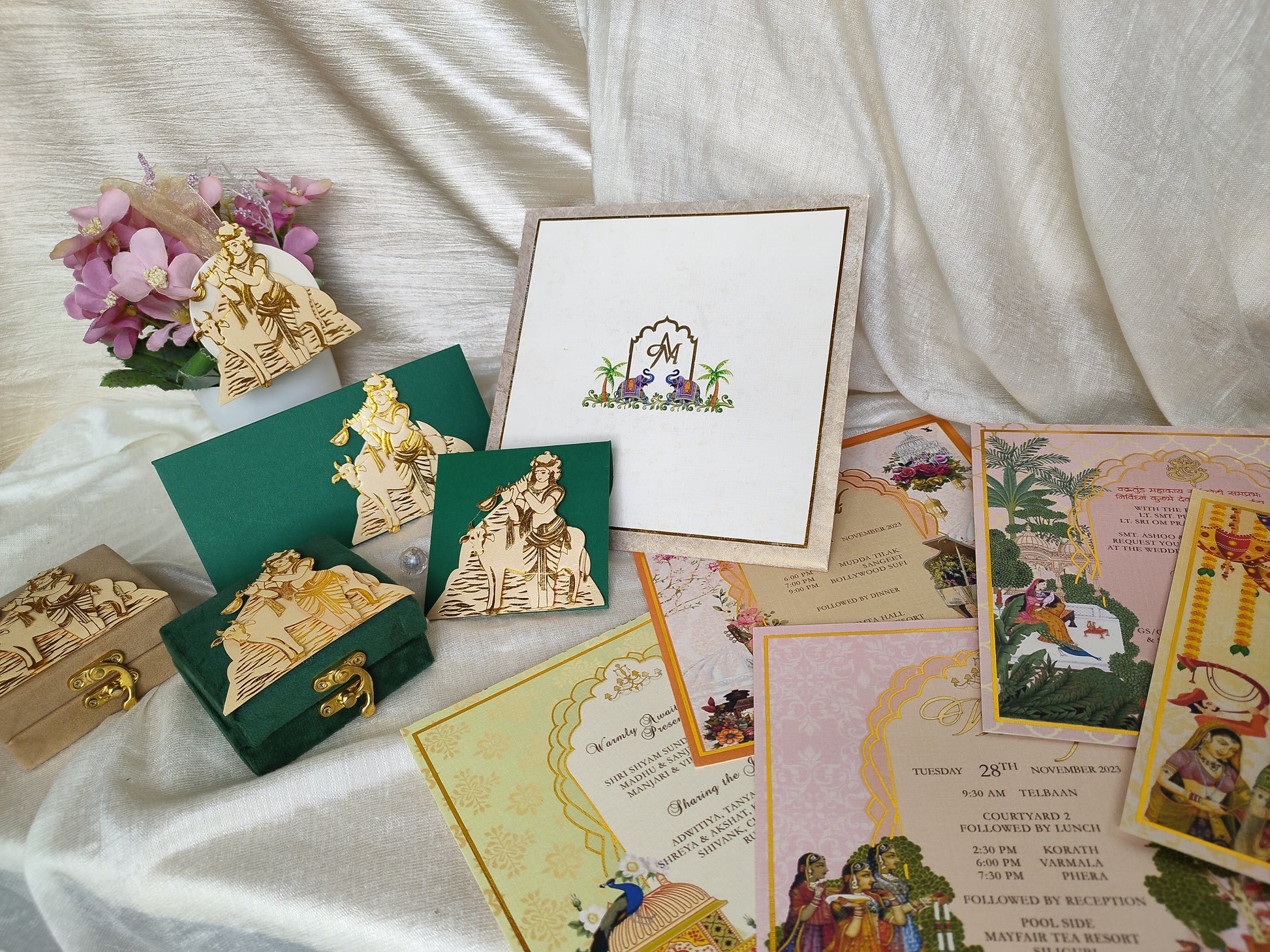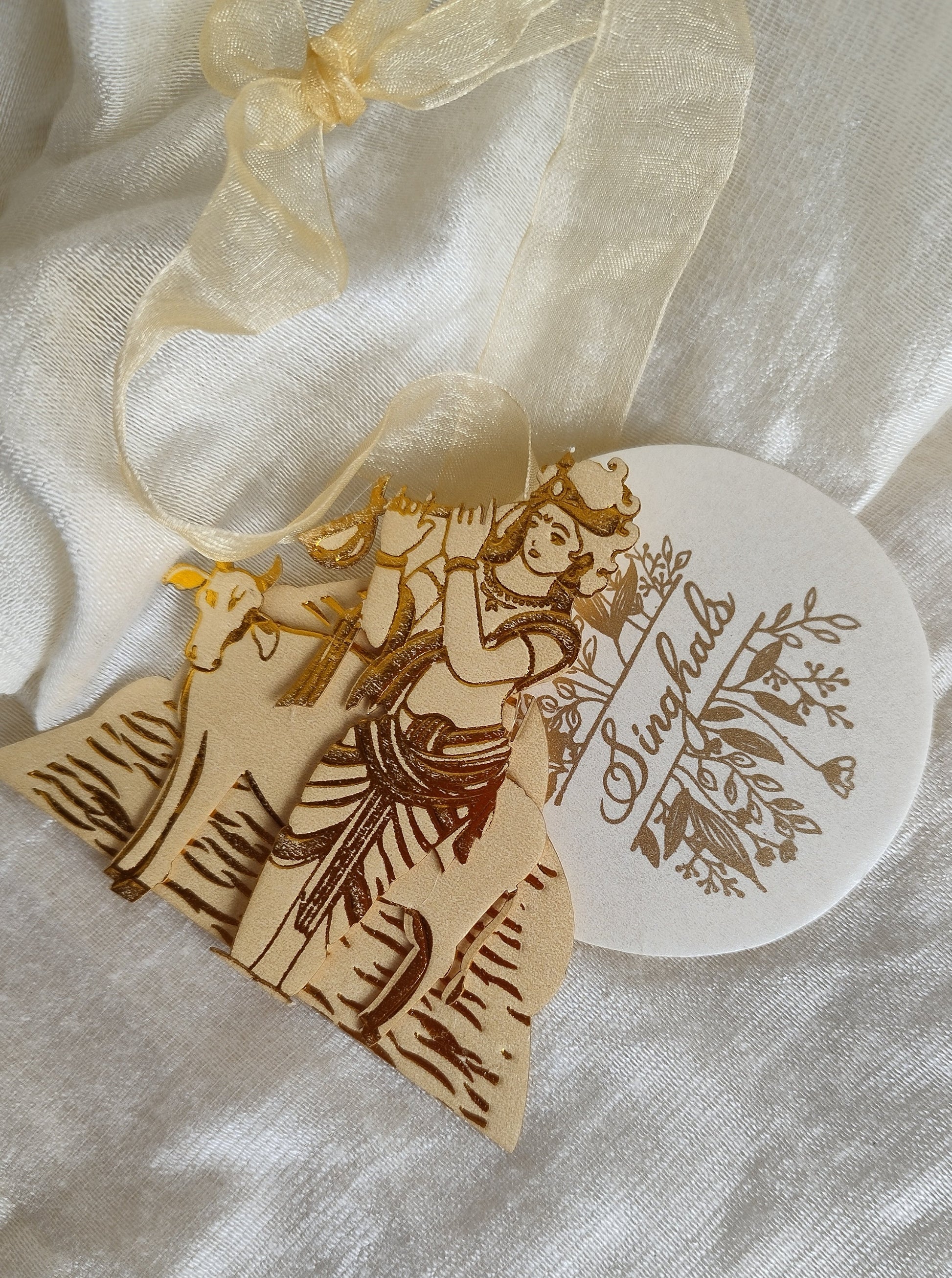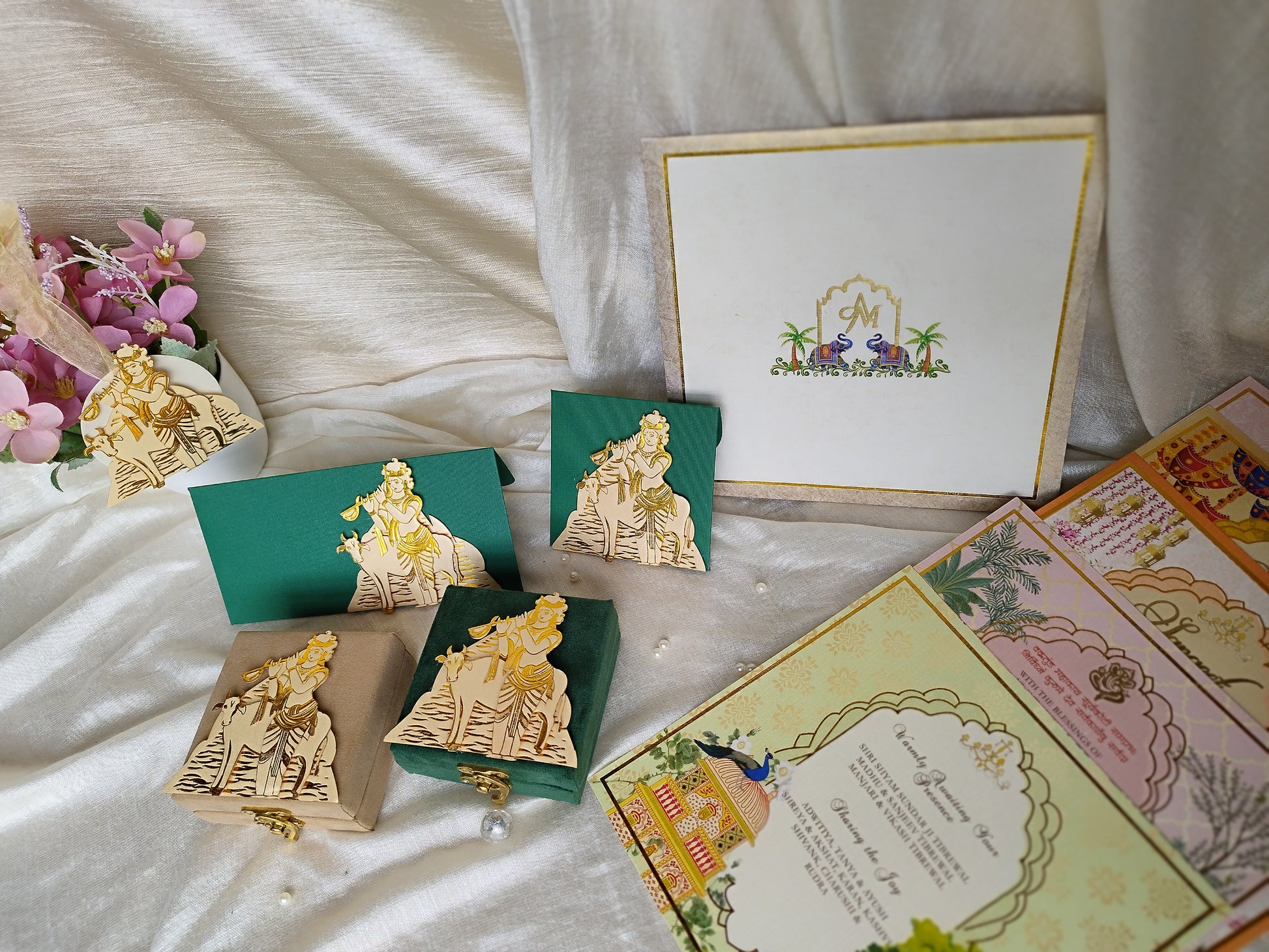 We used the same Krishna and cow design on the small envelopes and also on the velvet green and beige boxes. These boxes were decorated with a foil-embossed cutout and finished with a round tag on top, keeping the theme consistent and graceful.