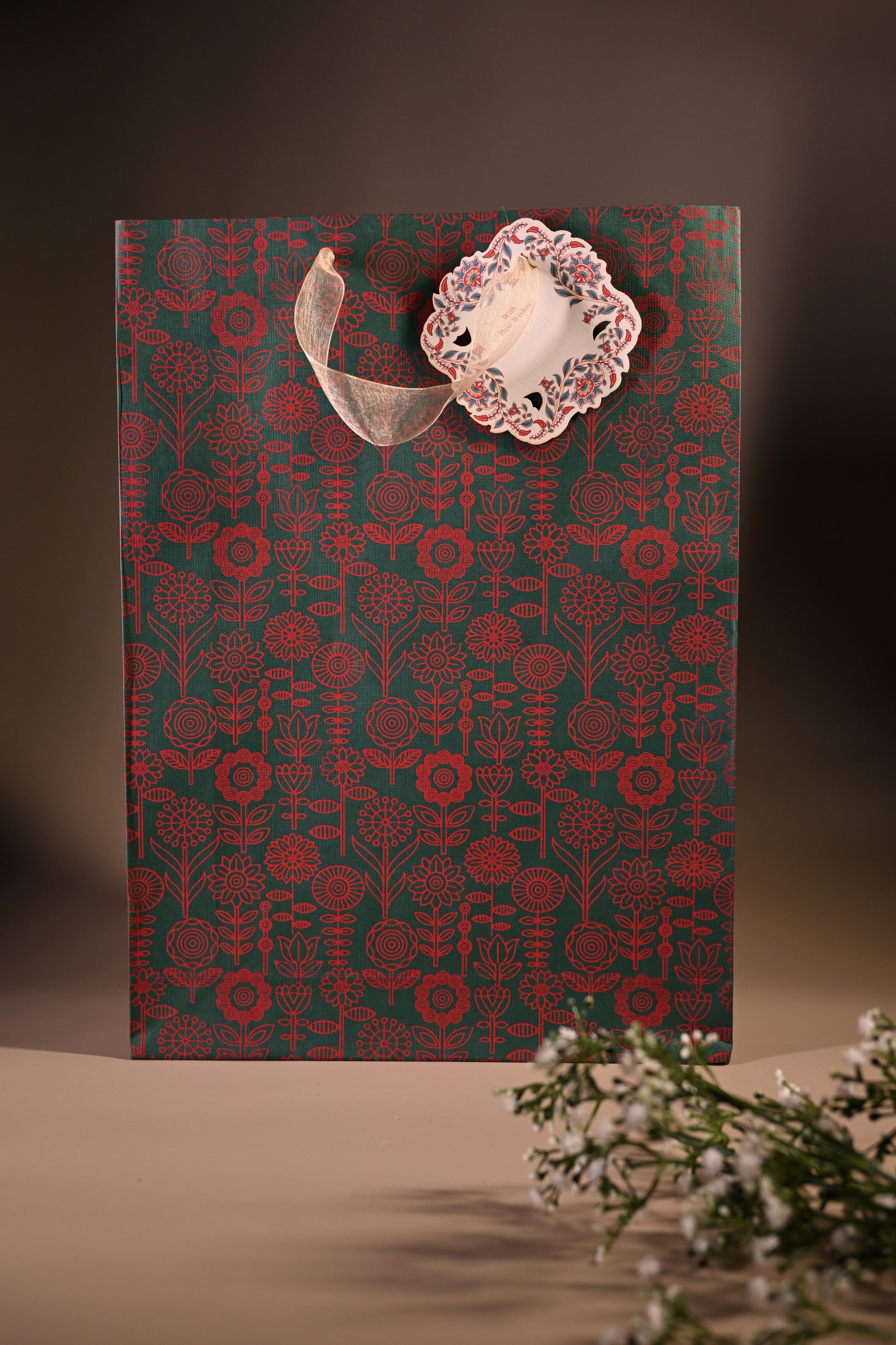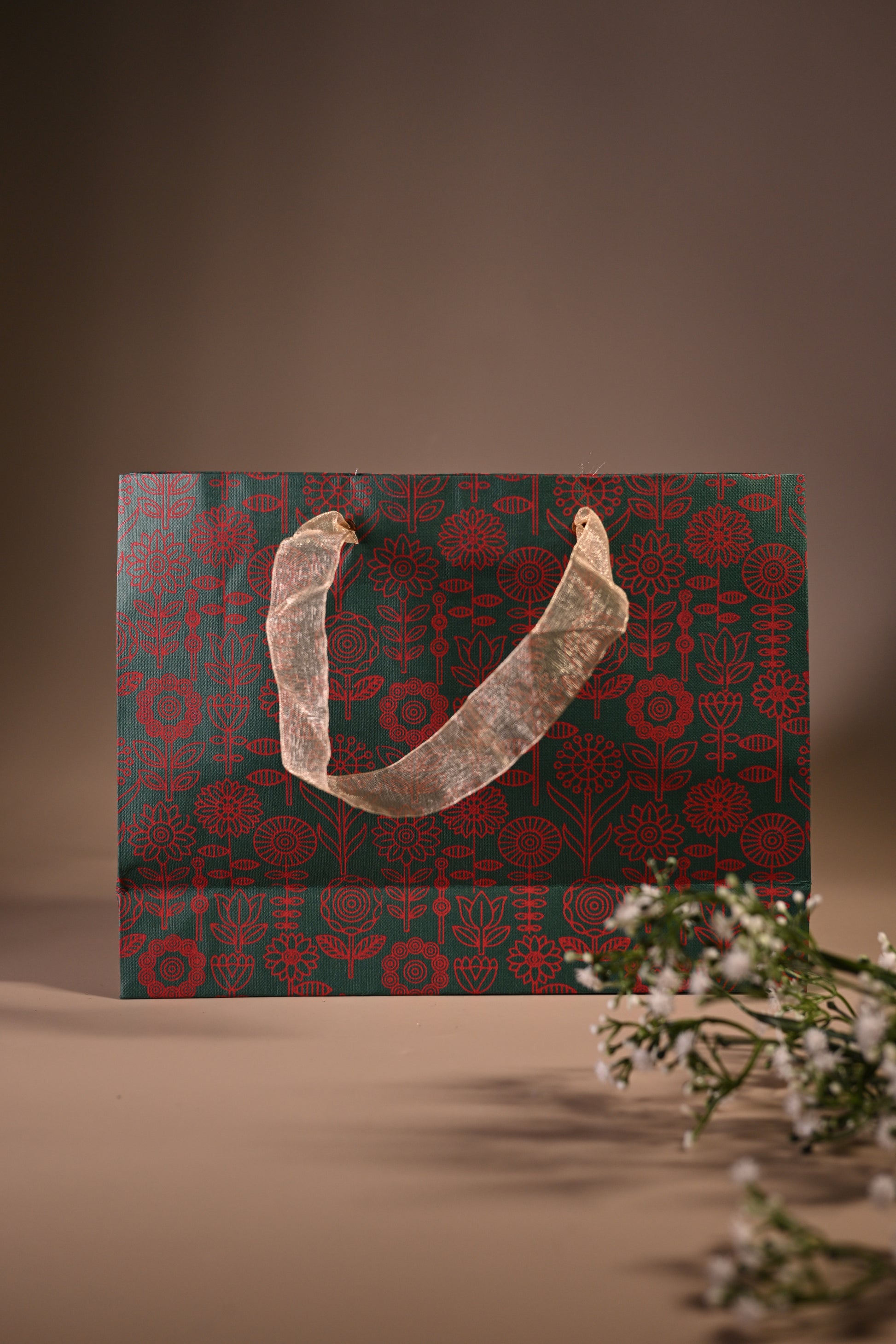 This is a beautiful handmade paper bag, perfect for gifting. It has a rich blue background with elegant red floral designs printed all over it. The bag is tied with a soft, transparent tissue ribbon, giving it a delicate and classy touch. There's also a matching tag attached, which you can write on.