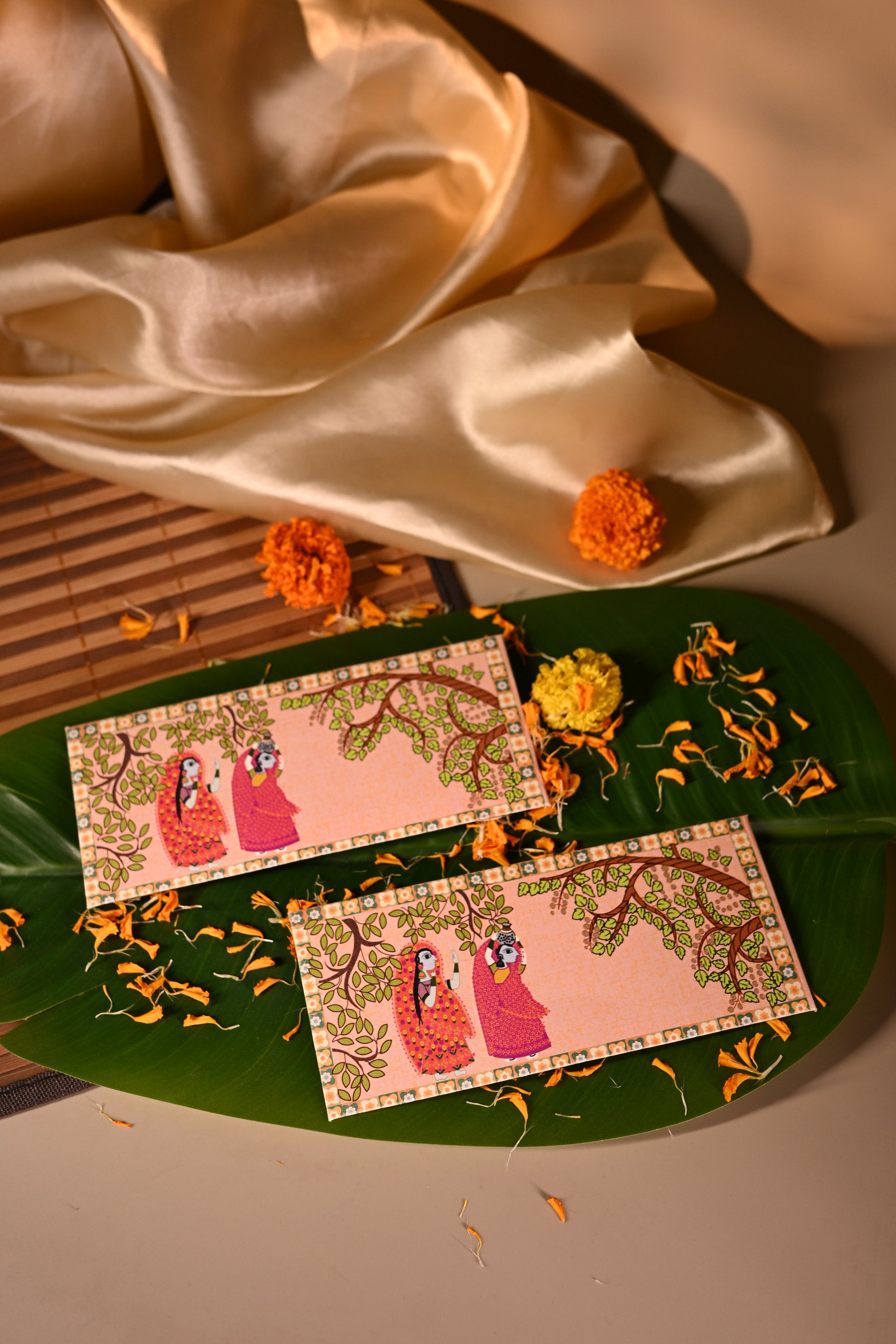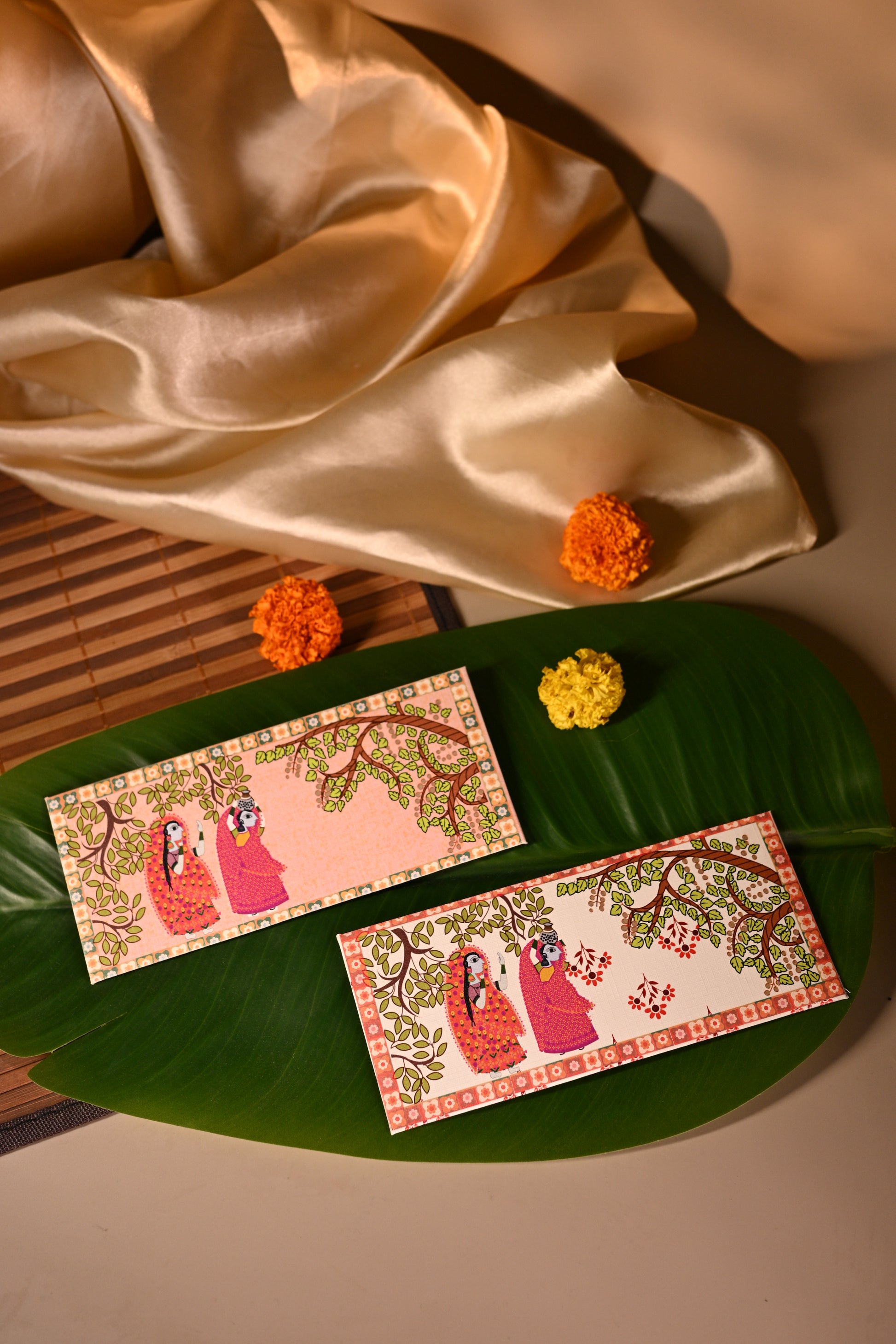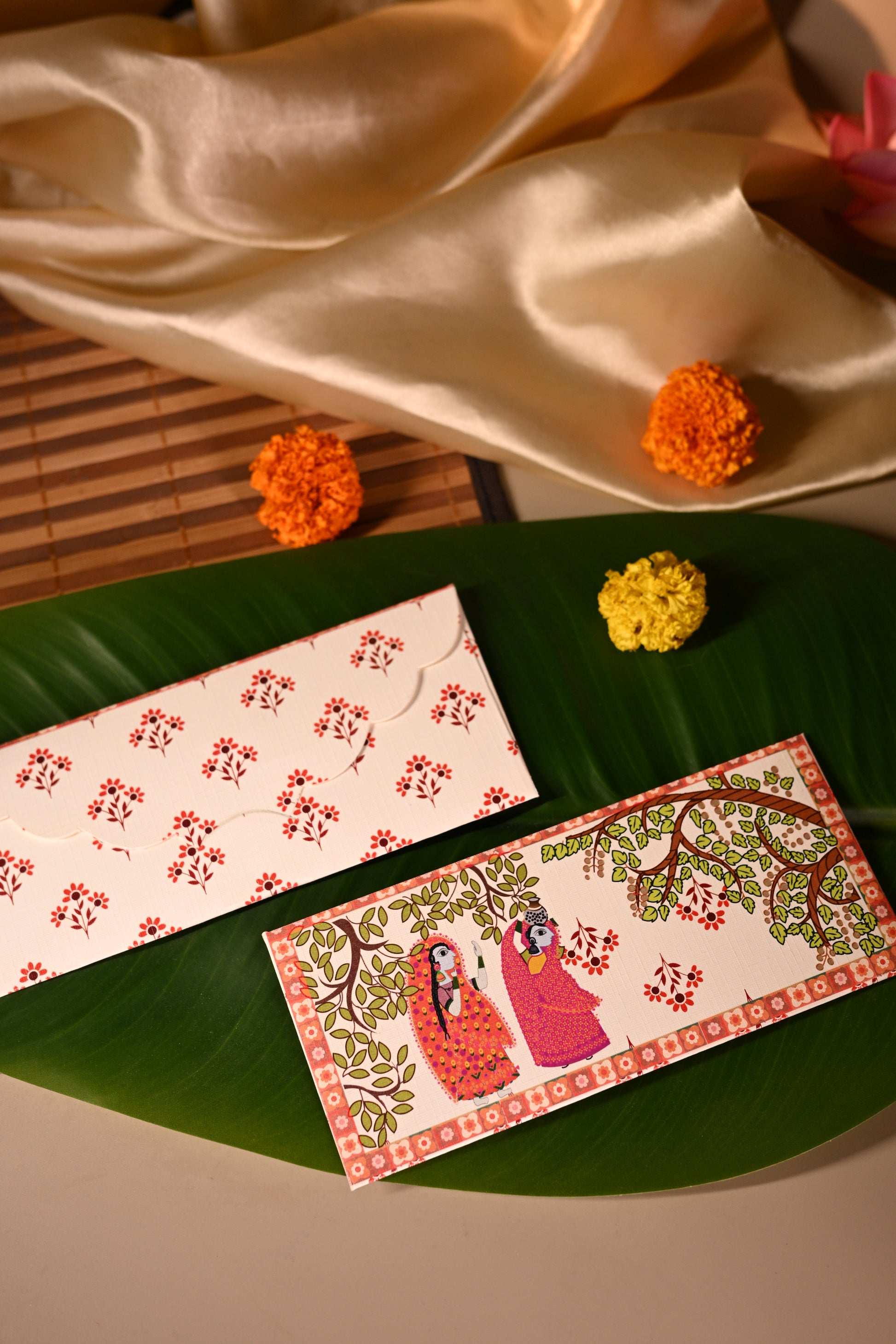 This charming envelope is inspired by traditional Madhubani art. It features a crisp white background with tiny red floral prints all over the flap side. The front is beautifully illustrated with two women in traditional attire carrying pots under a blooming tree. Surrounded by green leaves, red blossoms, and a pink floral border, this envelope is perfect for adding a cultural and artistic touch to your gifting.