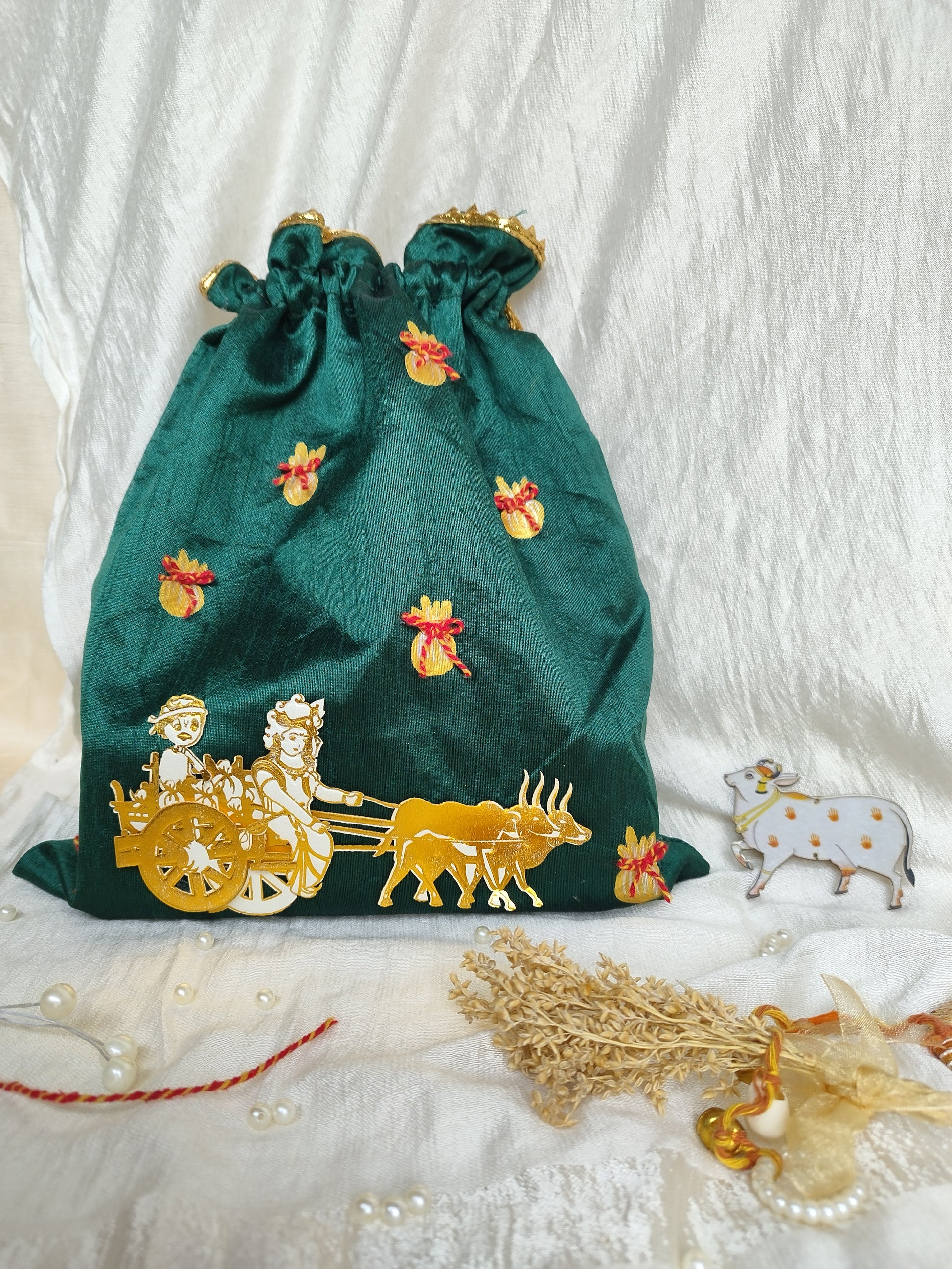 We also decorate dry fruit potlis with the same design and hand-paint them. Each potli is tied with a traditional red thread (moli).