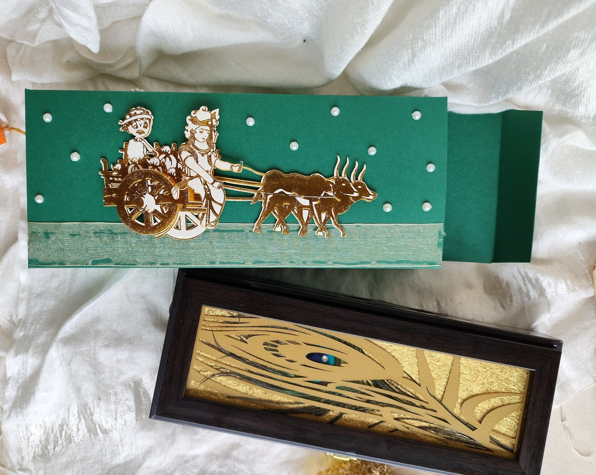 The customer wants their products in the Mayra theme. We make money envelopes in 4 colors, decorated with foil embossing of Krishna and Mayraji on a bullock cart.