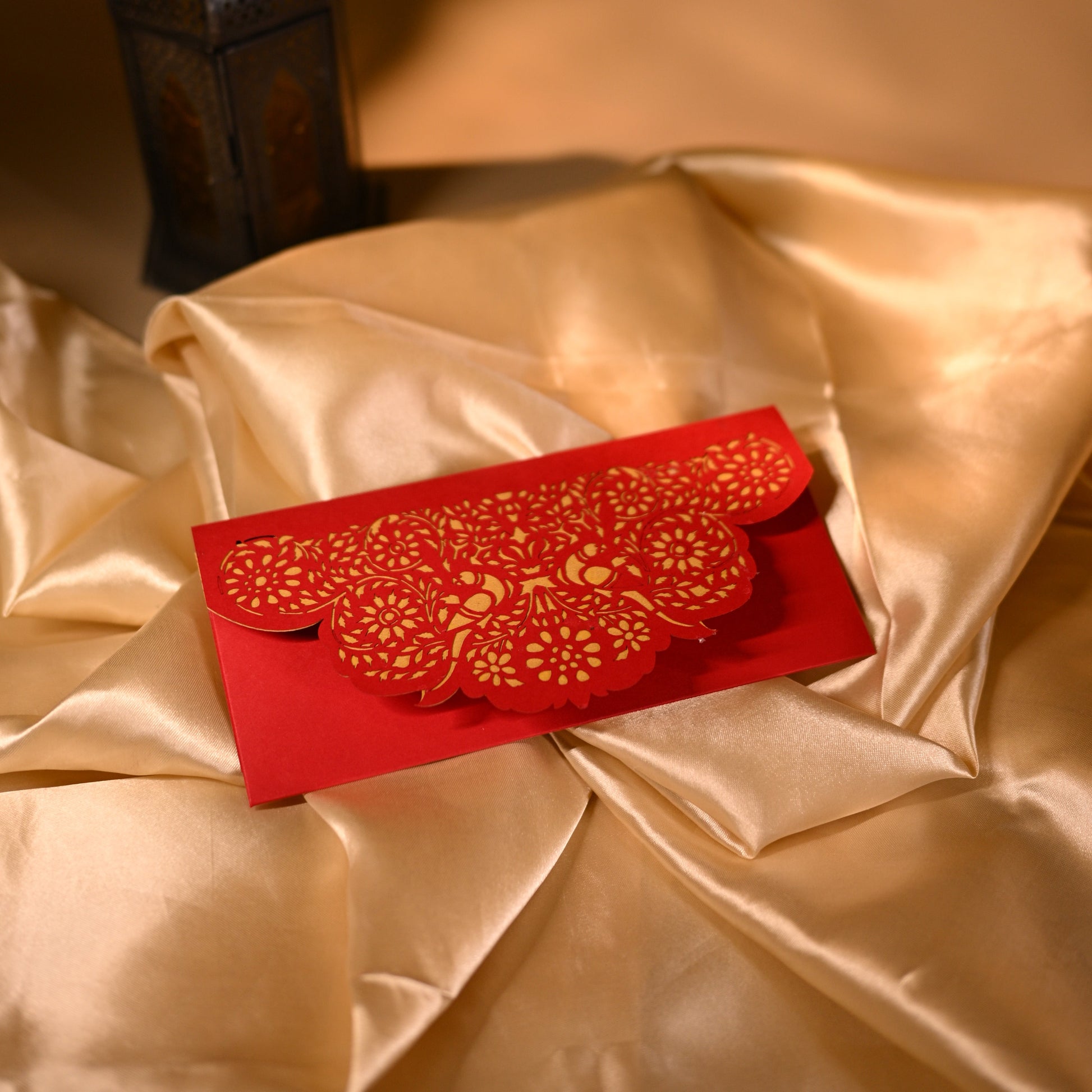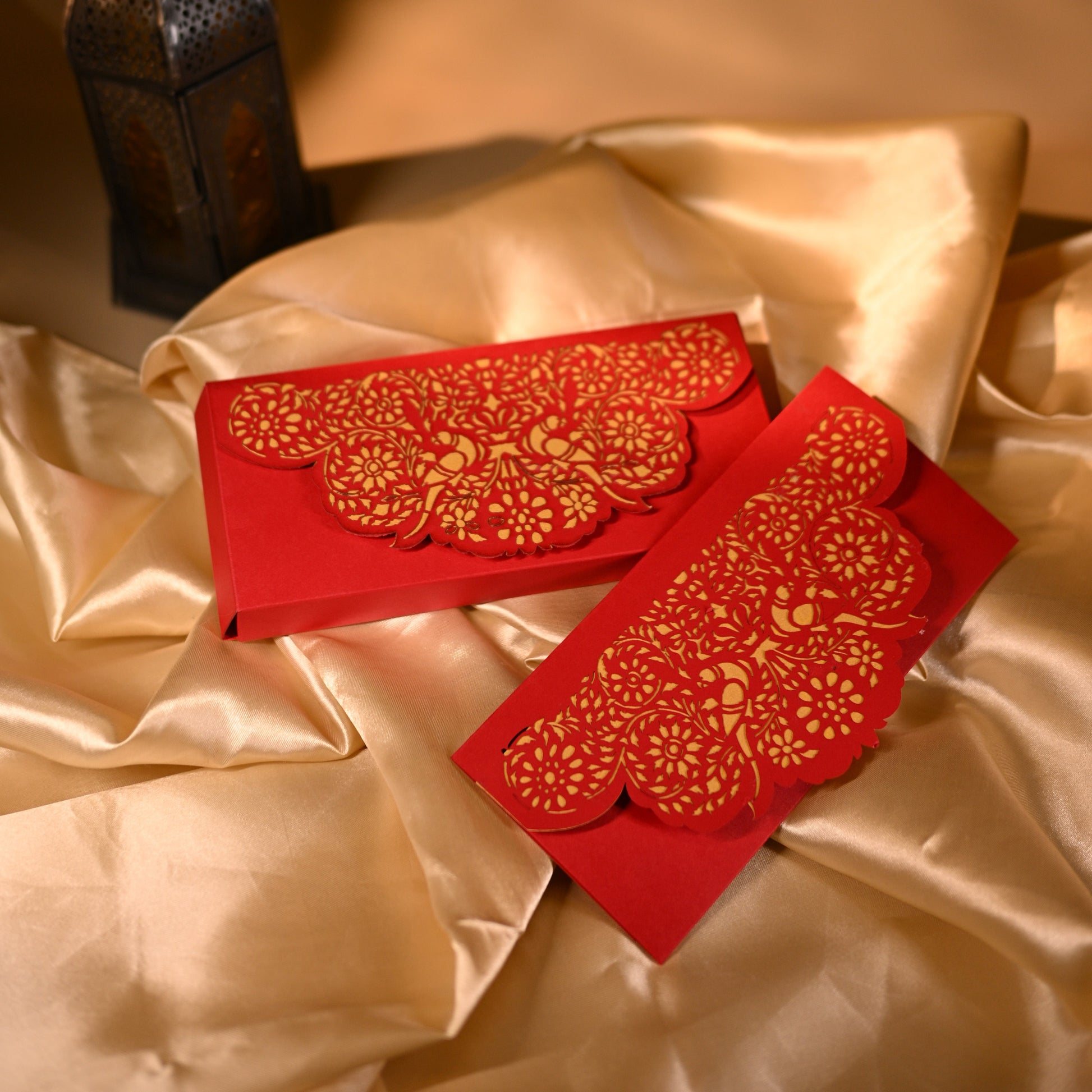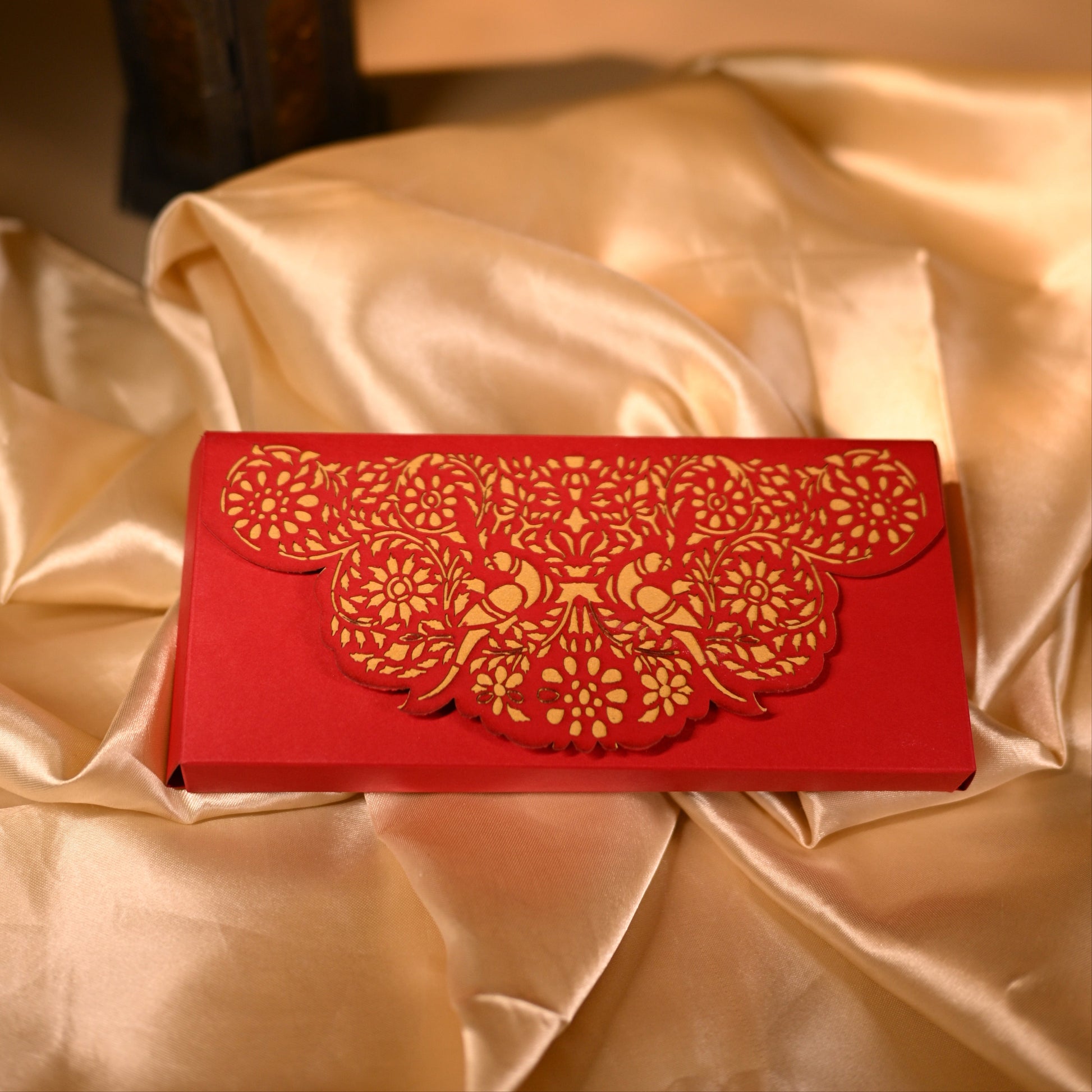 This flap-style red cash box is designed for traditional functions with a laser-cut design. There is a beautiful parrot and floral cutting with golden paper showing through it’s cuts, which makes the box more elegant.