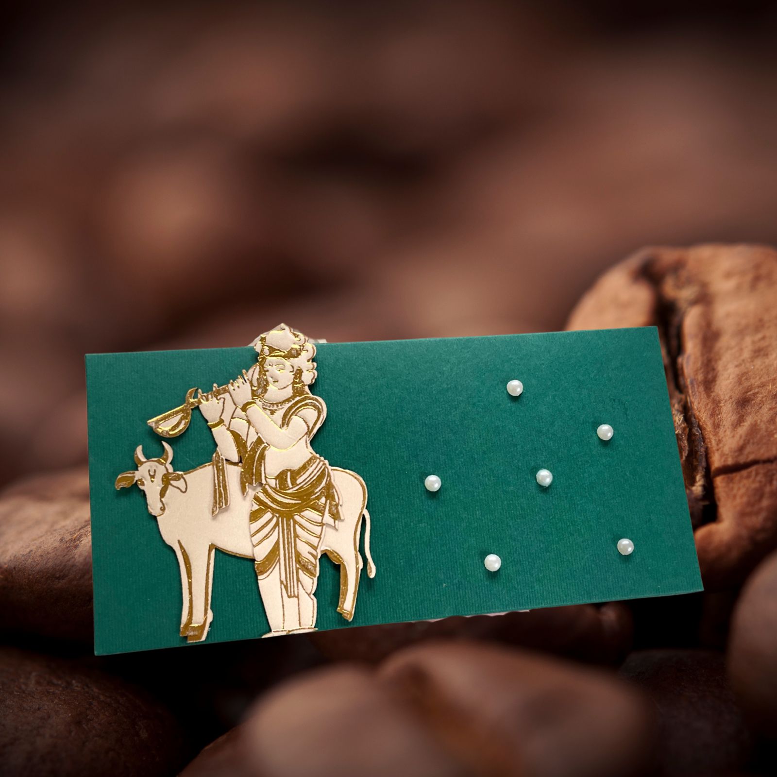 This bliss full cash box is made of Texture paper. On the left side, there is a golden foil embossed design showing a cow and Lord Krishna, making it look traditional and elegant.
