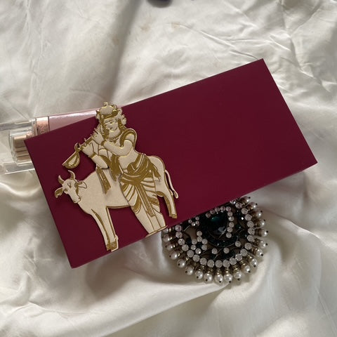 This bliss full cash box is made of maroon belvet paper. On the left side, there is a golden foil embossed design showing a cow and Lord Krishna, making it look traditional and elegant.
