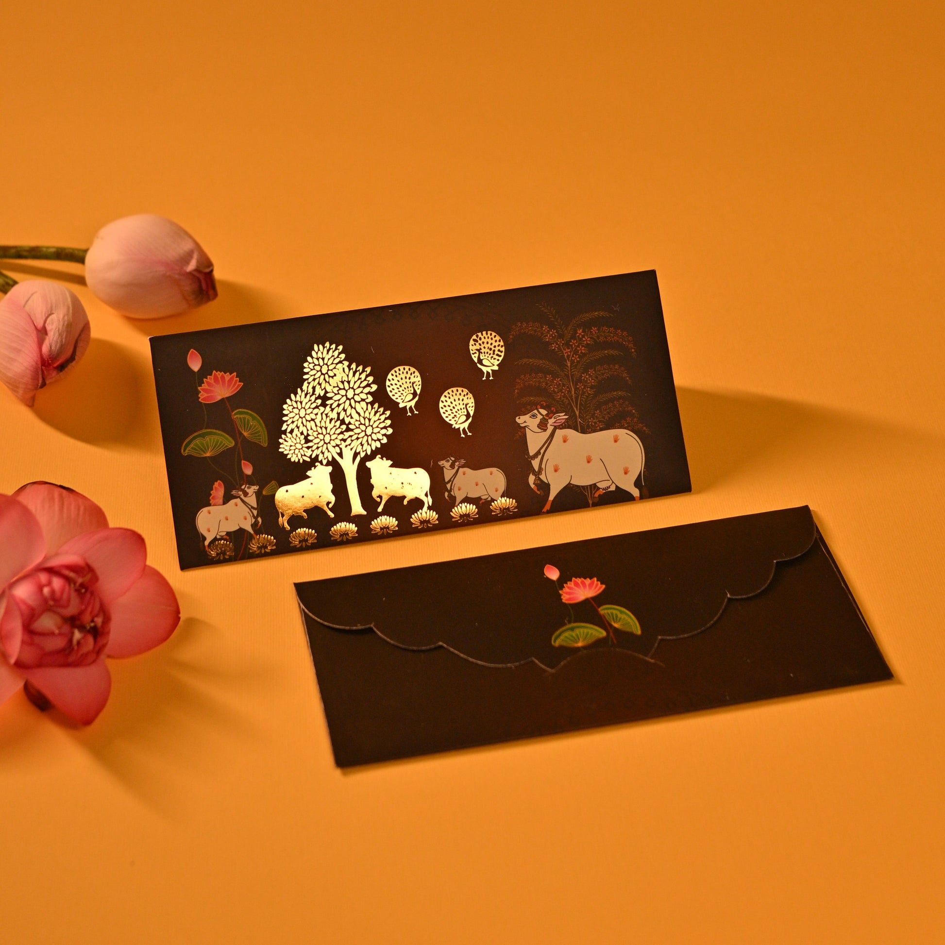 This rich brown envelope features a beautiful traditional scene with foil detailing. It showcases peaceful cows, blooming lotus flowers, and detailed trees with shiny black and gold foil accents.