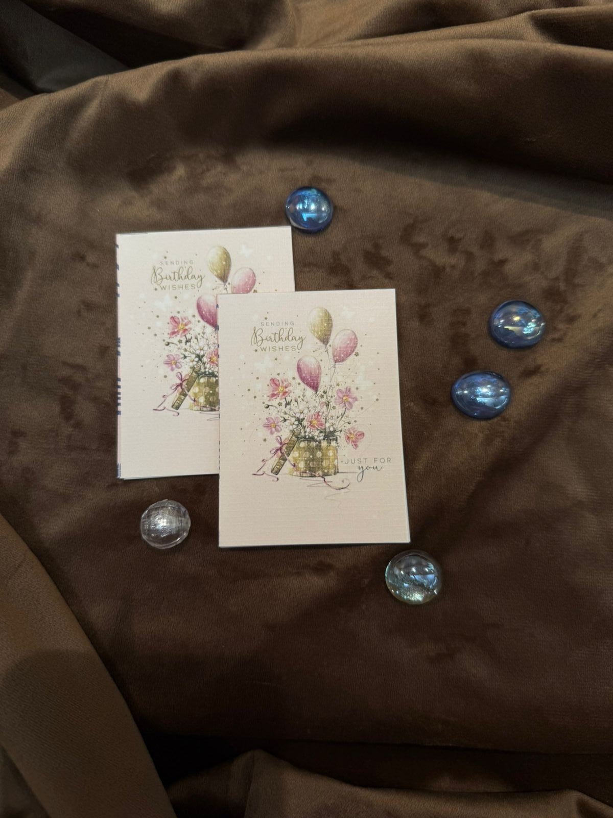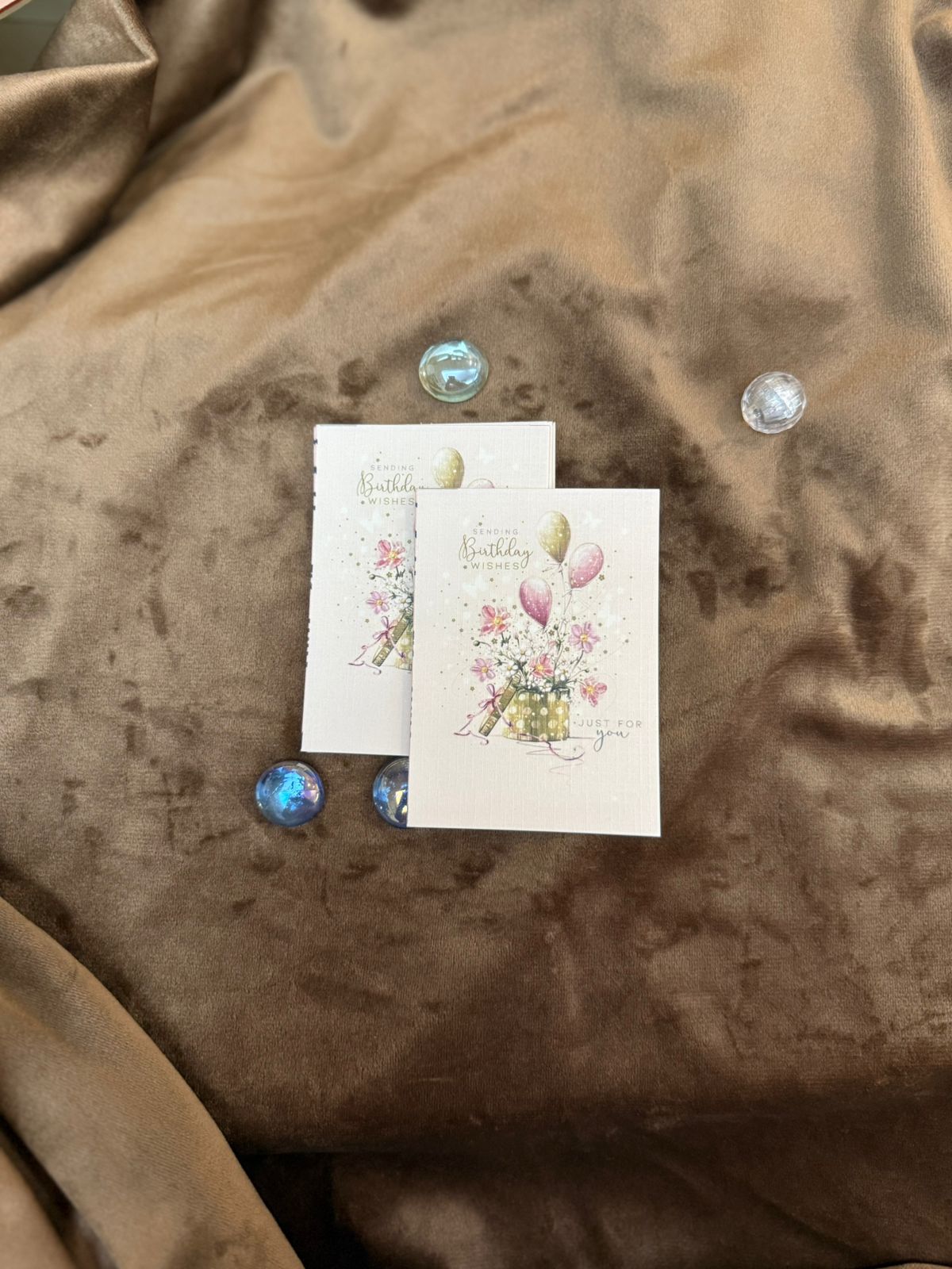 This birthday gift tag has a fun design with a gift box in the center popping out a balloon and sparkles. On the left side " Sending Birthday Wishes ". its a cheerful way to make any birthday gift extra special.