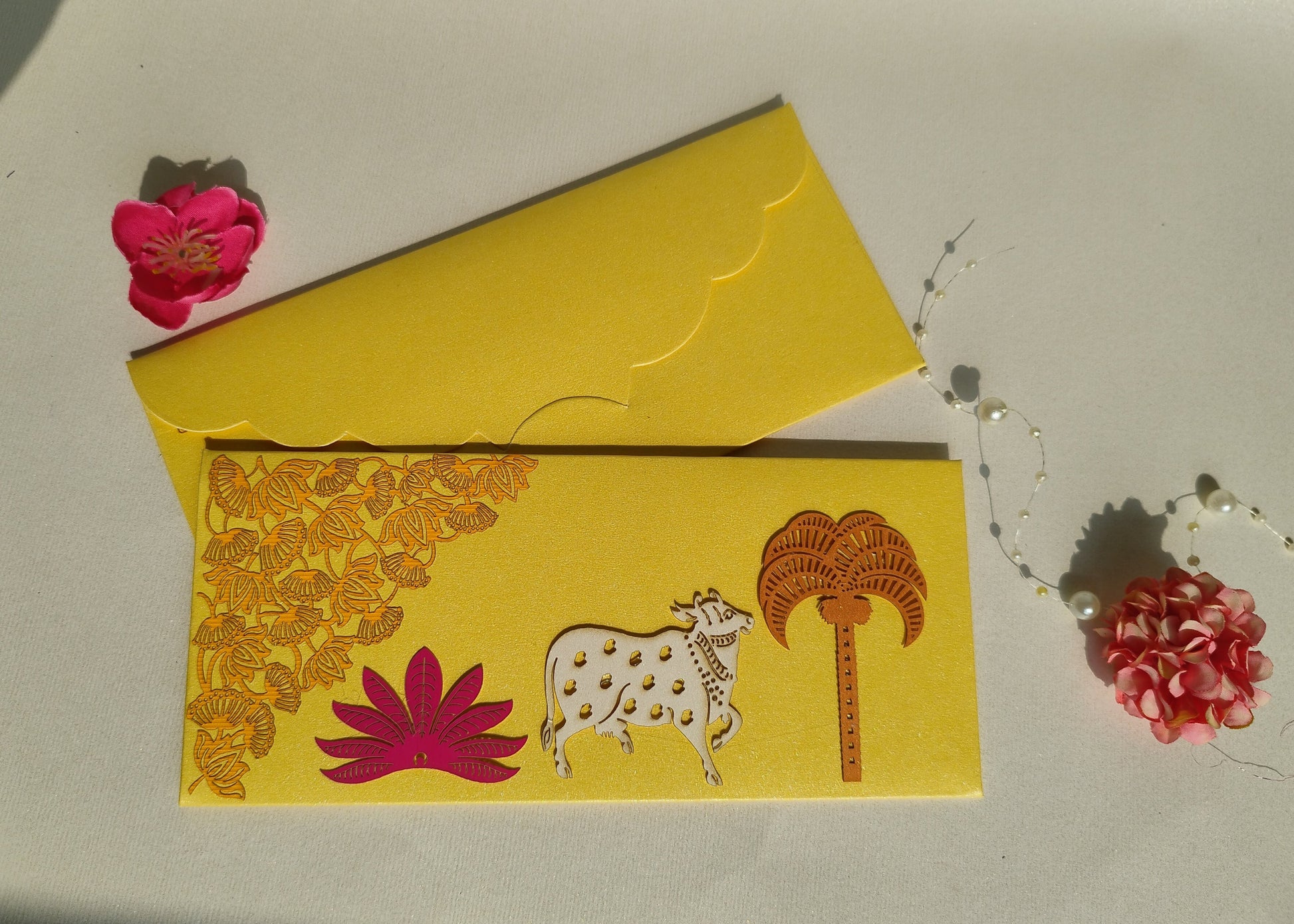 It is decorated with a triangular lotus laser cut design that adds a unique and artistic touch to the envelope. On the right side, there is a coconut tree design, and in the centre, there is a Nandi ji, giving it a traditional and spiritual feel. Below or around Nandi ji, a beautiful pink lotus is placed, adding a soft and elegant finishing touch.