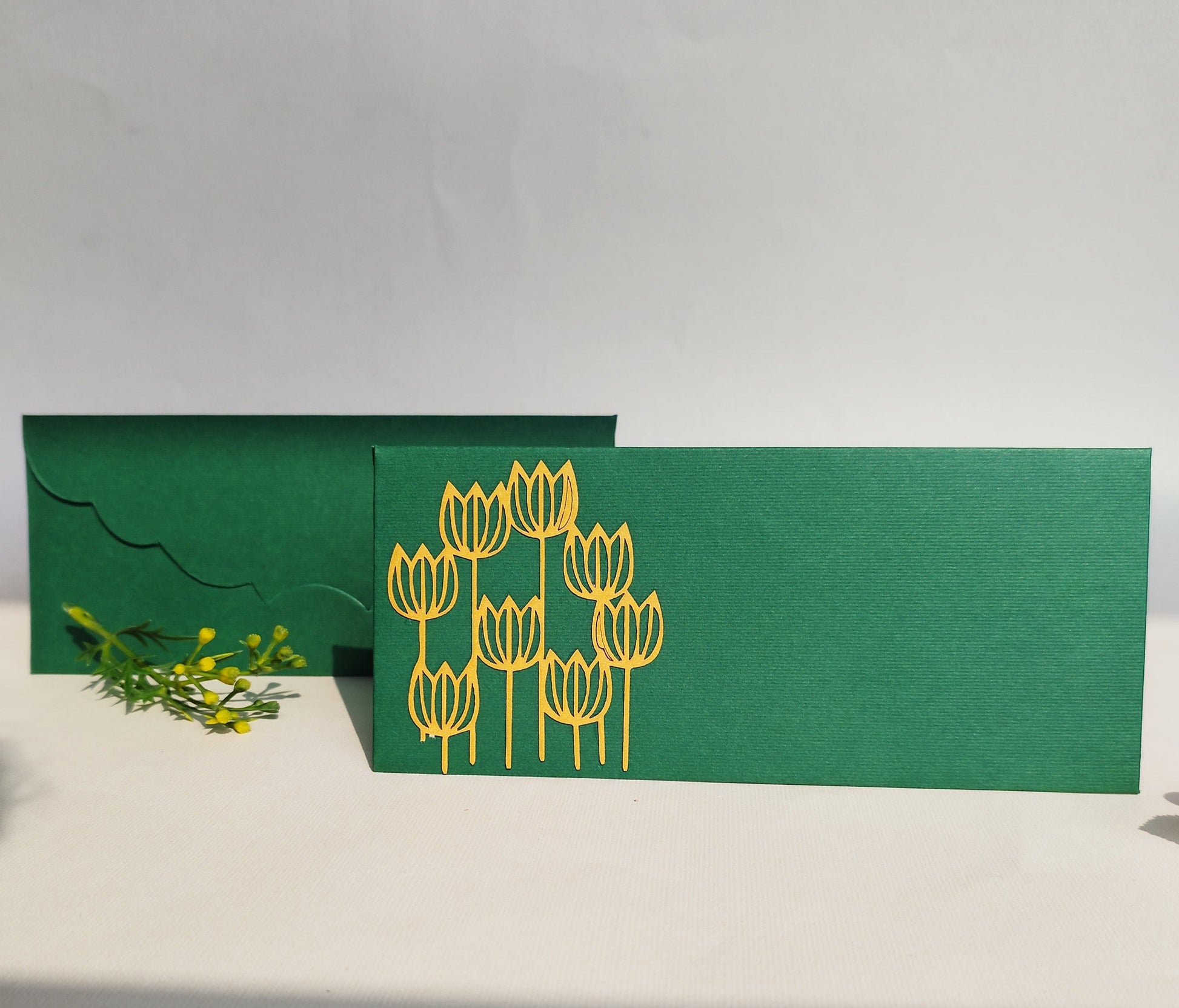 This is a purple envelope with a simple yet elegant design. On the left side, there is a beautiful pink tulip flower made with laser cutting and carefully pasted on the envelope. The fine details and bright color of the tulip make the envelope look unique, modern, and eye-catching.
